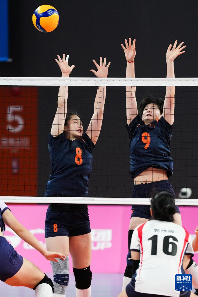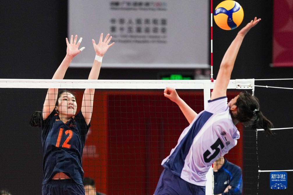 11月17日,四川队球员漆家瑄(左)在比赛中拦网。