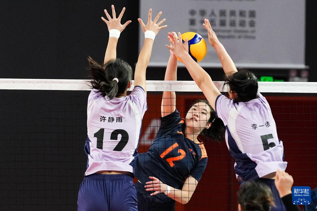11月17日,四川队球员漆家瑄(右二)在比赛中扣球。