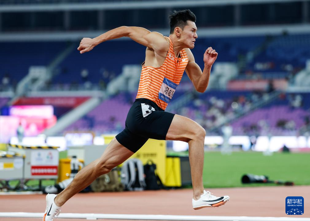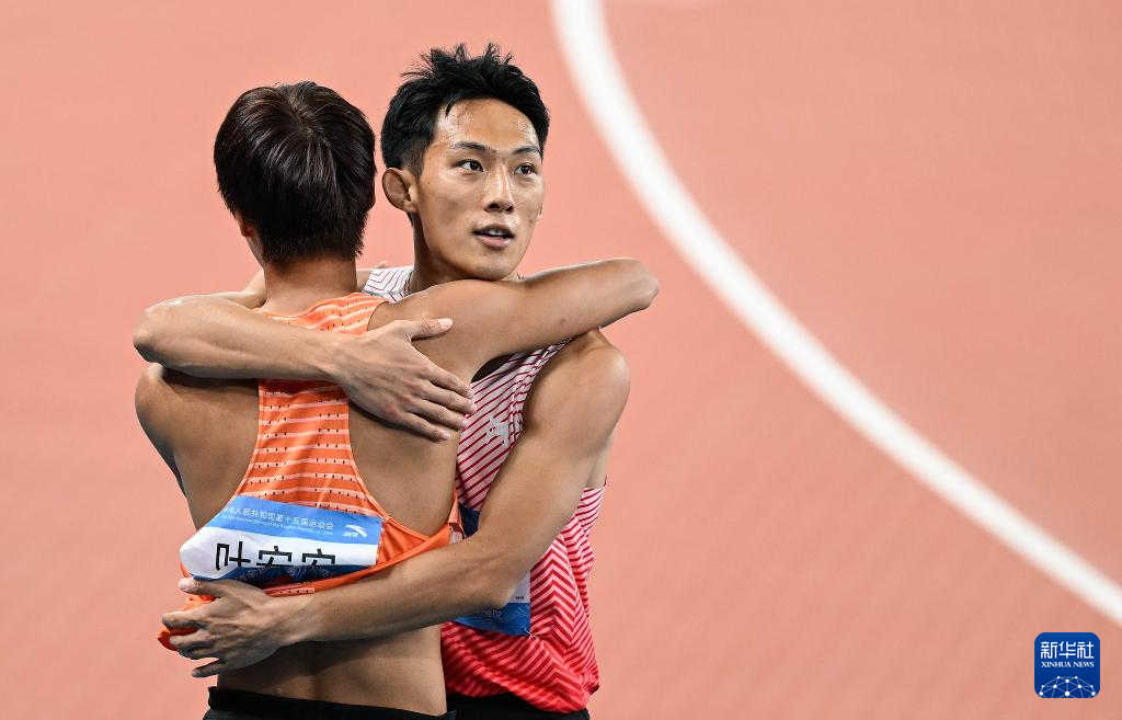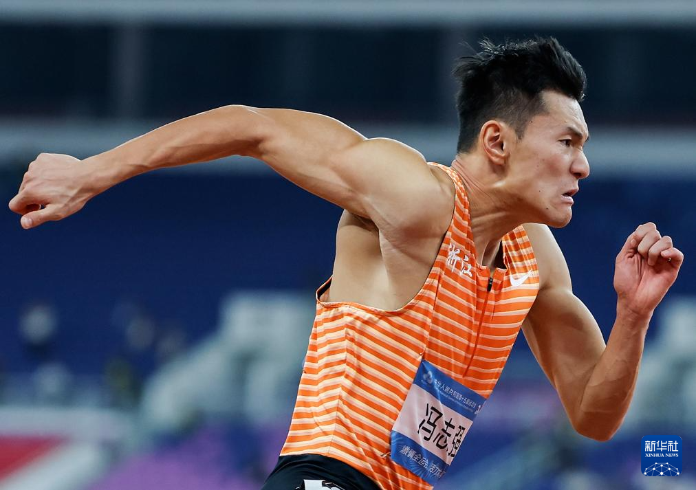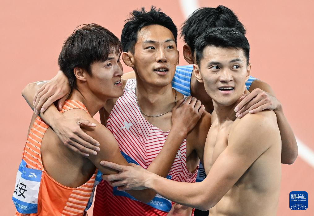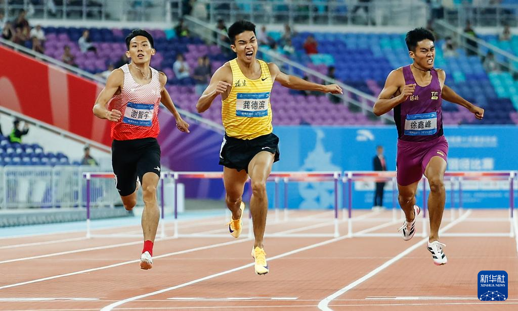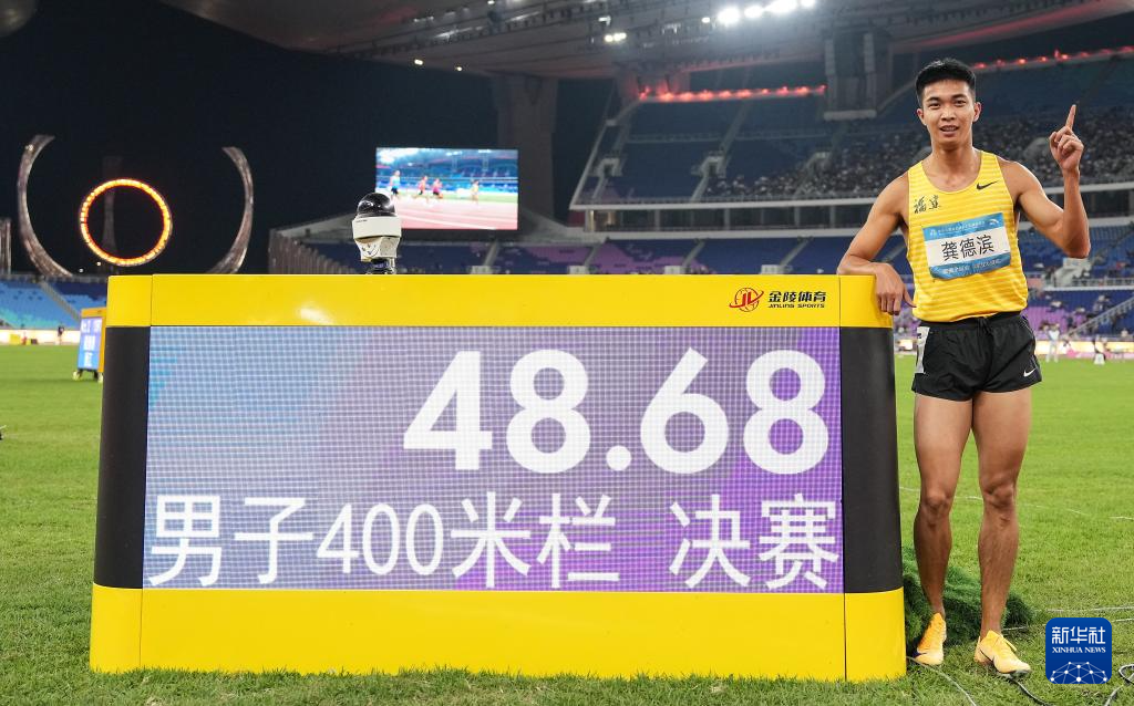 11月17日,福建队选手龚德滨在比赛后庆祝夺冠。他以48秒68的成绩刷新全国纪录。