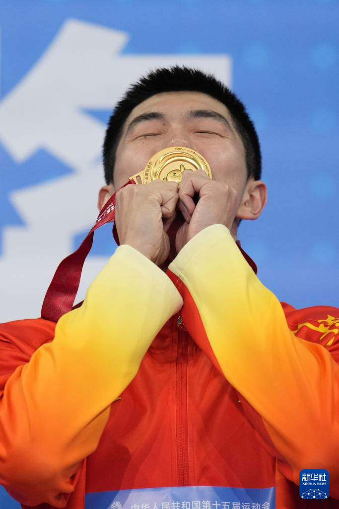 11月17日,湖北队选手闫子贝在颁奖仪式上亲吻金牌。
