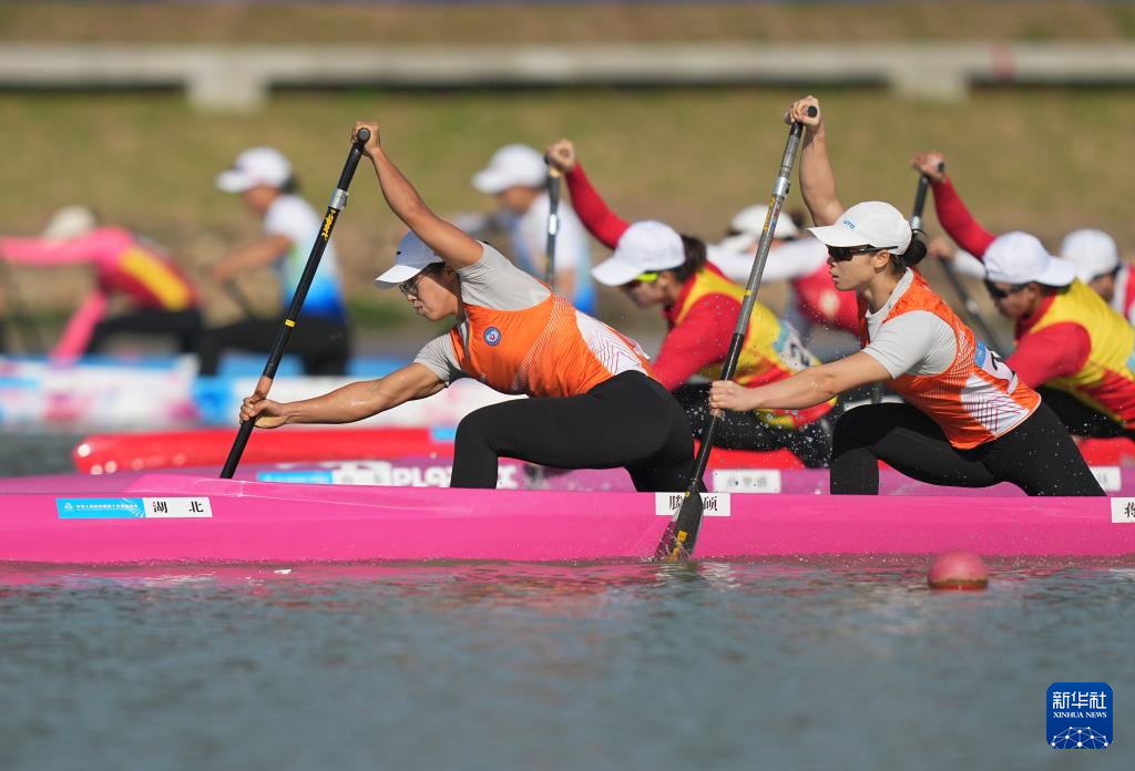 11月17日,湖北队选手滕安硕(前左)/蒋希娜(前右)在女子500米双人划艇决赛A中。最终,她们获得亚军。