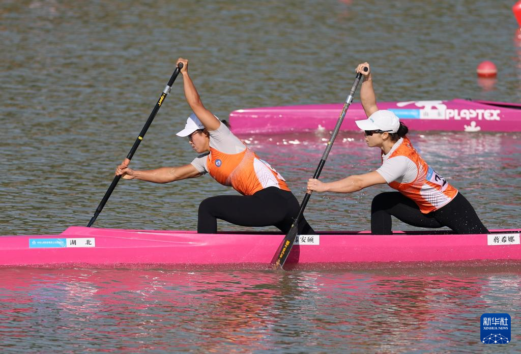 11月17日,湖北队选手滕安硕/蒋希娜在女子500米双人划艇决赛A中。最终,她们获得亚军。