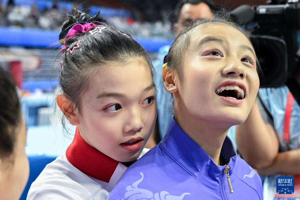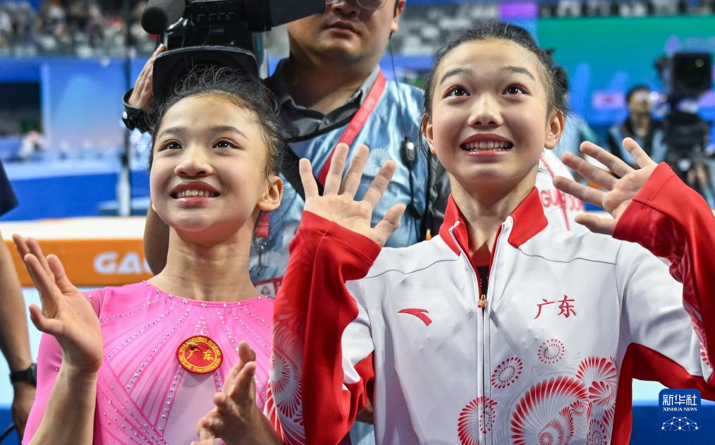 11月17日,广东队选手柯沁沁(右)与队友钟圻在比赛后向观众致意。柯沁沁夺得冠军。