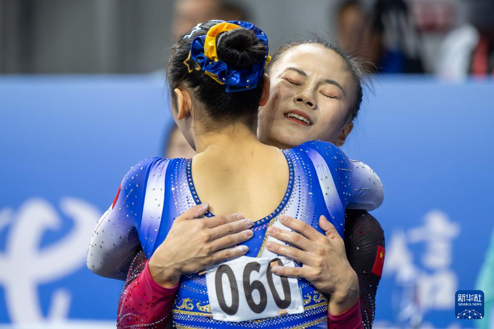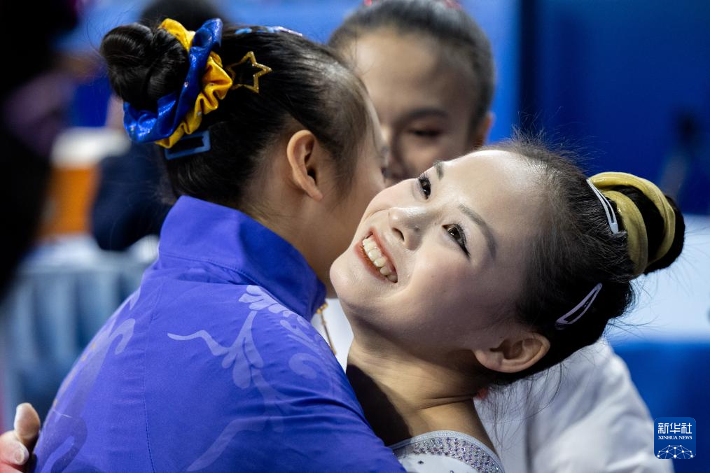11月17日,广东队选手柯沁沁(左)与福建队选手邱祺缘在比赛后拥抱。柯沁沁夺得冠军。