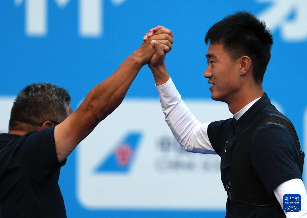 11月17日,山东队选手李梦麒(右)在金牌决赛后与教练庆祝胜利。他获得冠军。