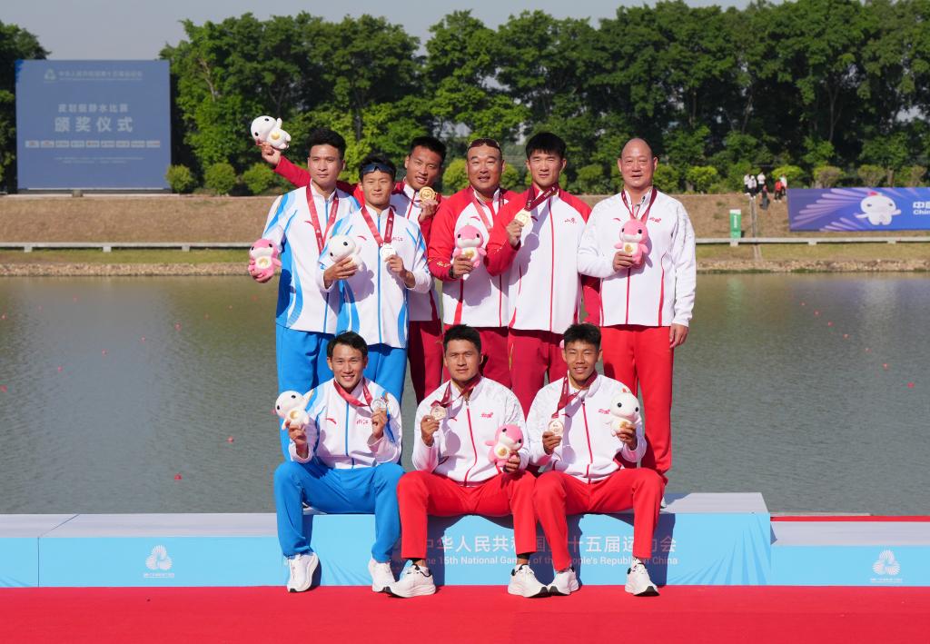 11月17日,冠军山东队选手于岳斌(后右二)/于陈伟(后左三)、亚军浙江队选手浙江队选手缪飞龙(后左二)/季博文(前左)、季军云南队选手刘浩(前中)/董树祥(前右)和他们的教练员在颁奖仪式上。当日,第十五届全国运动会皮划艇静水项目男子500米双人划艇决赛在广州举行。新华社记者 晋美多吉 摄
