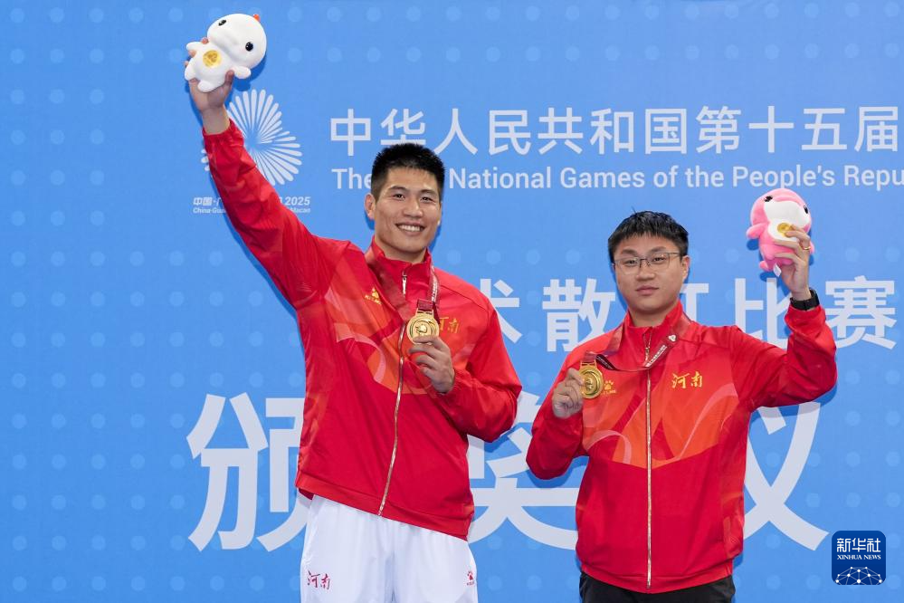 11月16日,冠军河南队选手王少华(左)和教练刘少云在颁奖仪式上。
