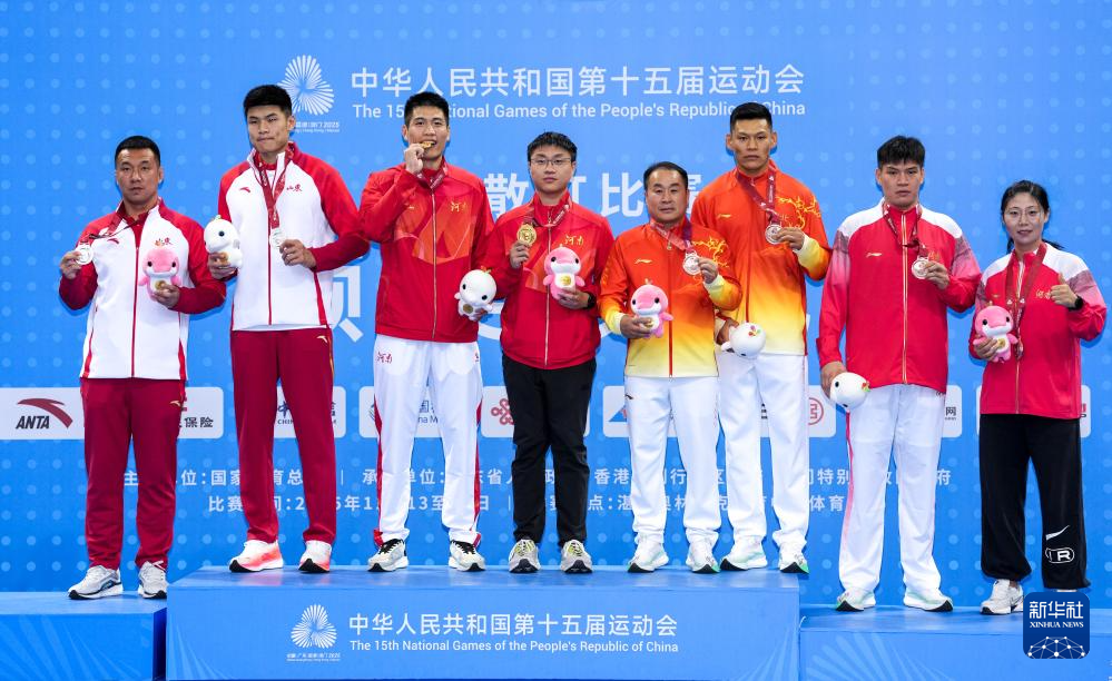 11月16日,冠军河南队选手王少华(左三)、亚军山东队选手翟辰溪(左二)、并列季军湖北队选手杜安(右三)、湖南队选手王振宇(右二)和教练在颁奖仪式上。