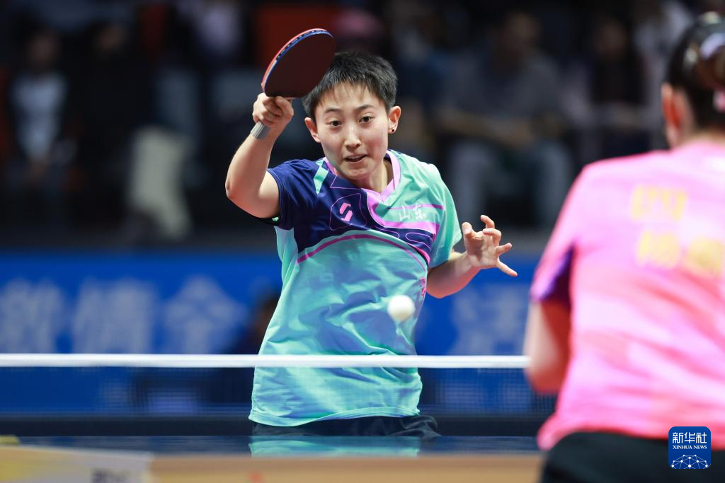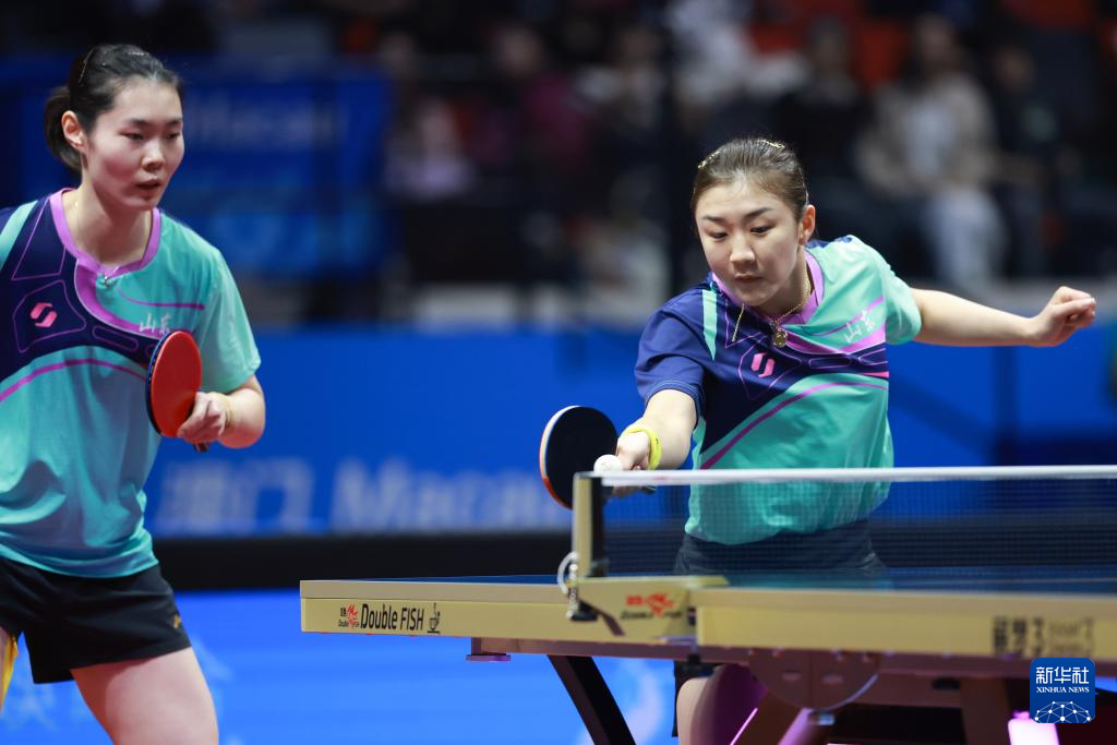 11月17日,四川队组合郭艳(右)/冷雨桐在比赛中回球,她们3比1战胜山东队组合孙艺祯/陈梦。