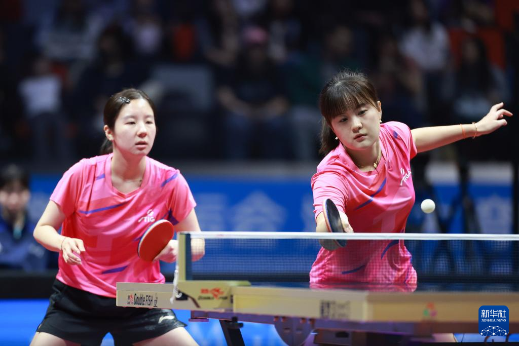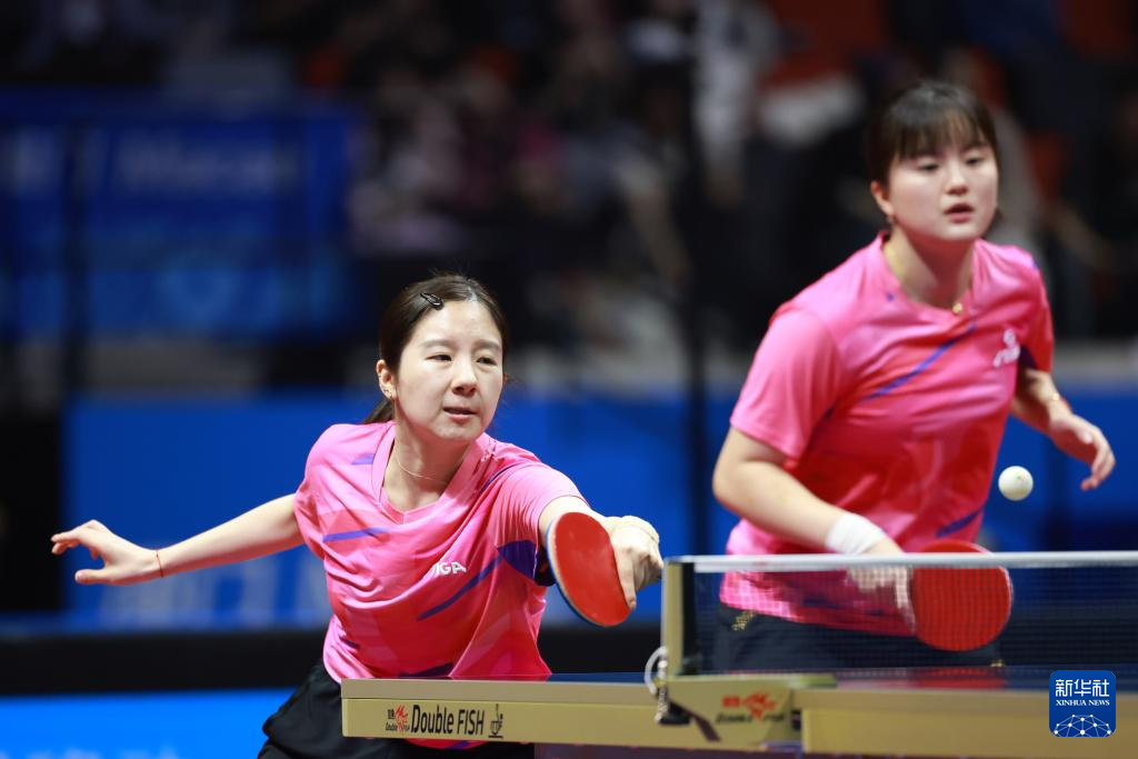 11月17日,四川队组合郭艳/冷雨桐(左)在比赛中回球,她们3比1战胜山东队组合孙艺祯/陈梦。