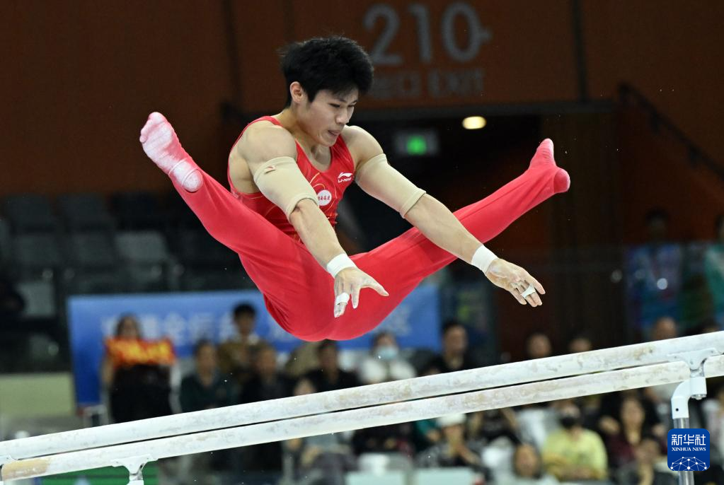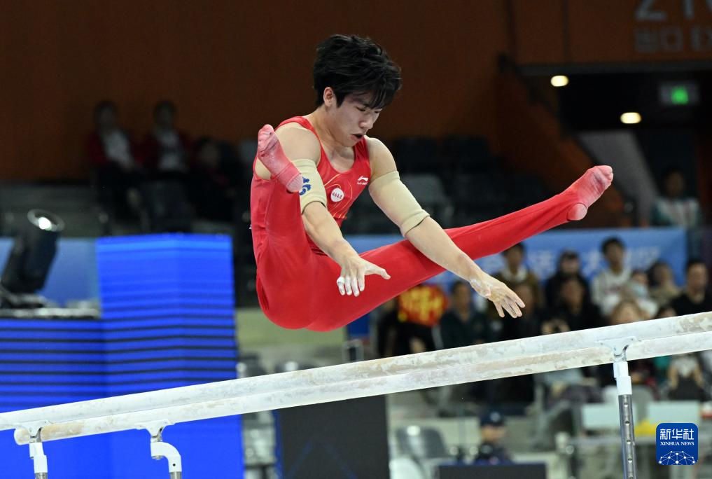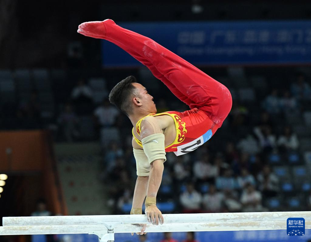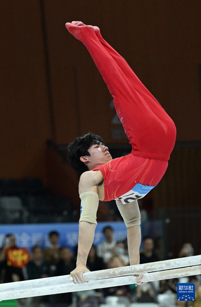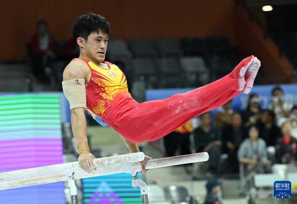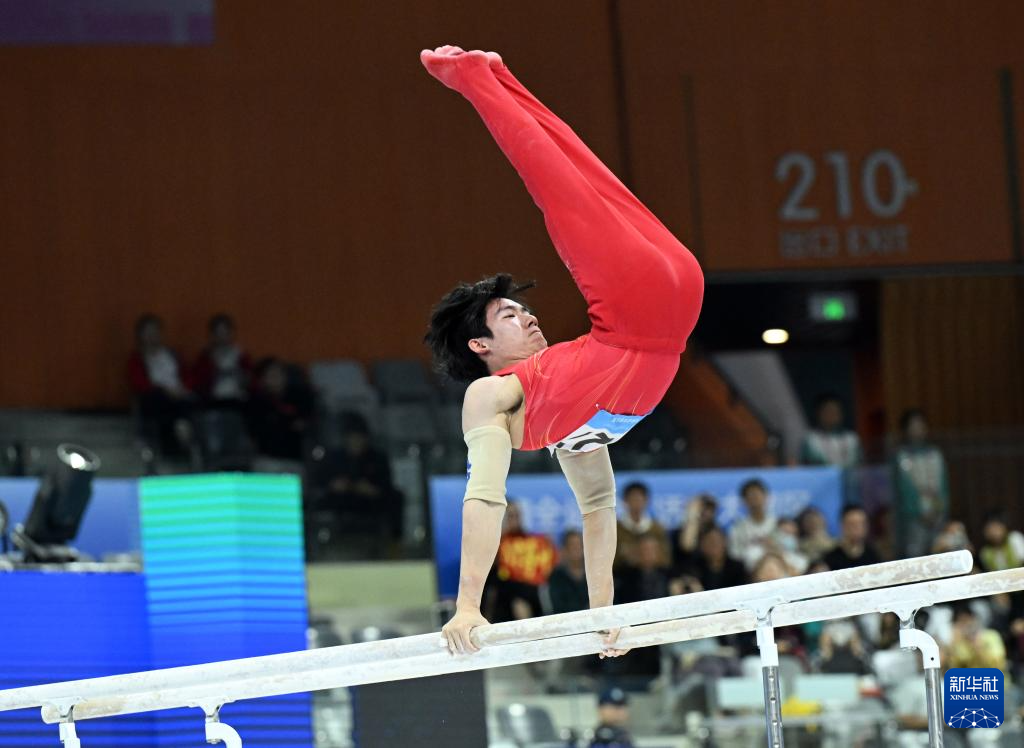 当日,第十五届全国运动会体操项目男子双杠决赛在广东肇庆举行。