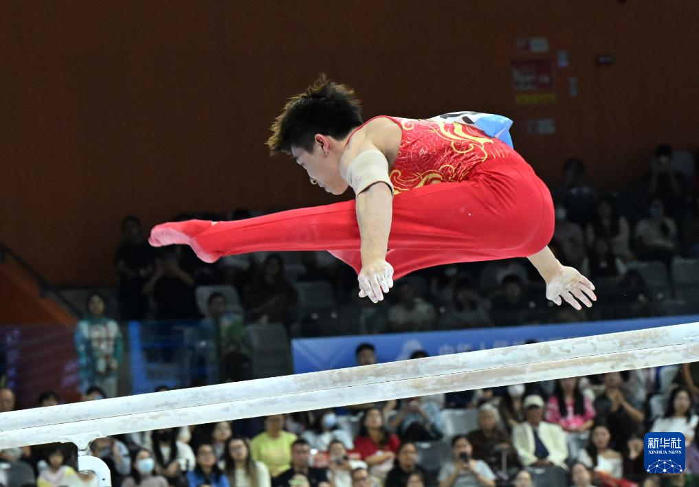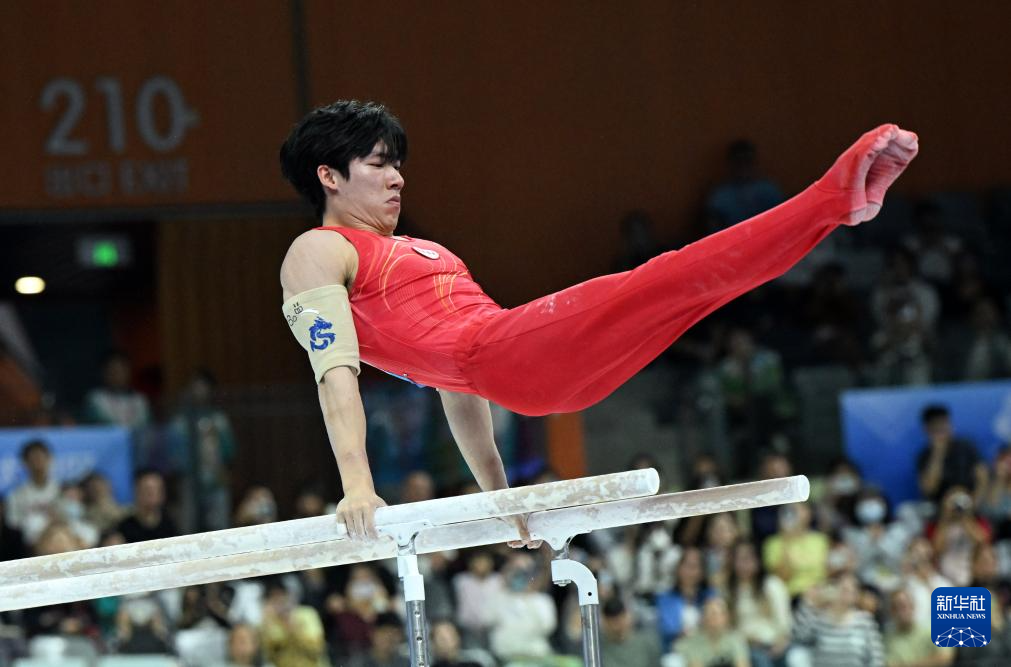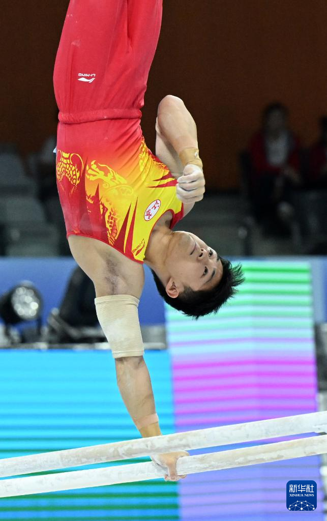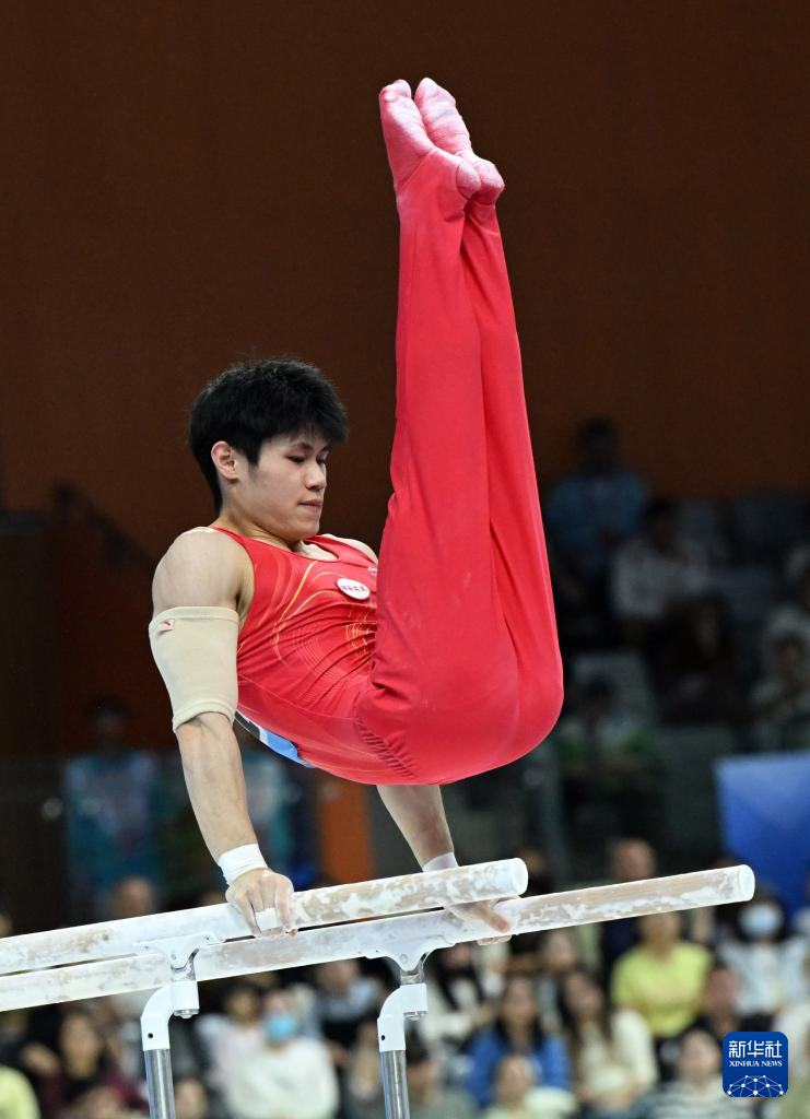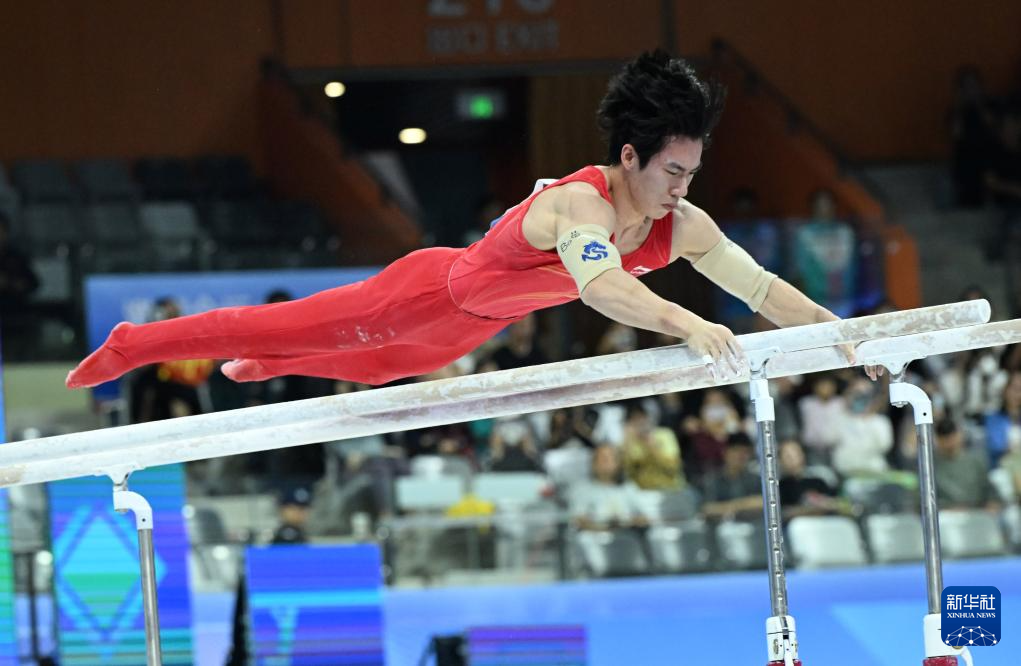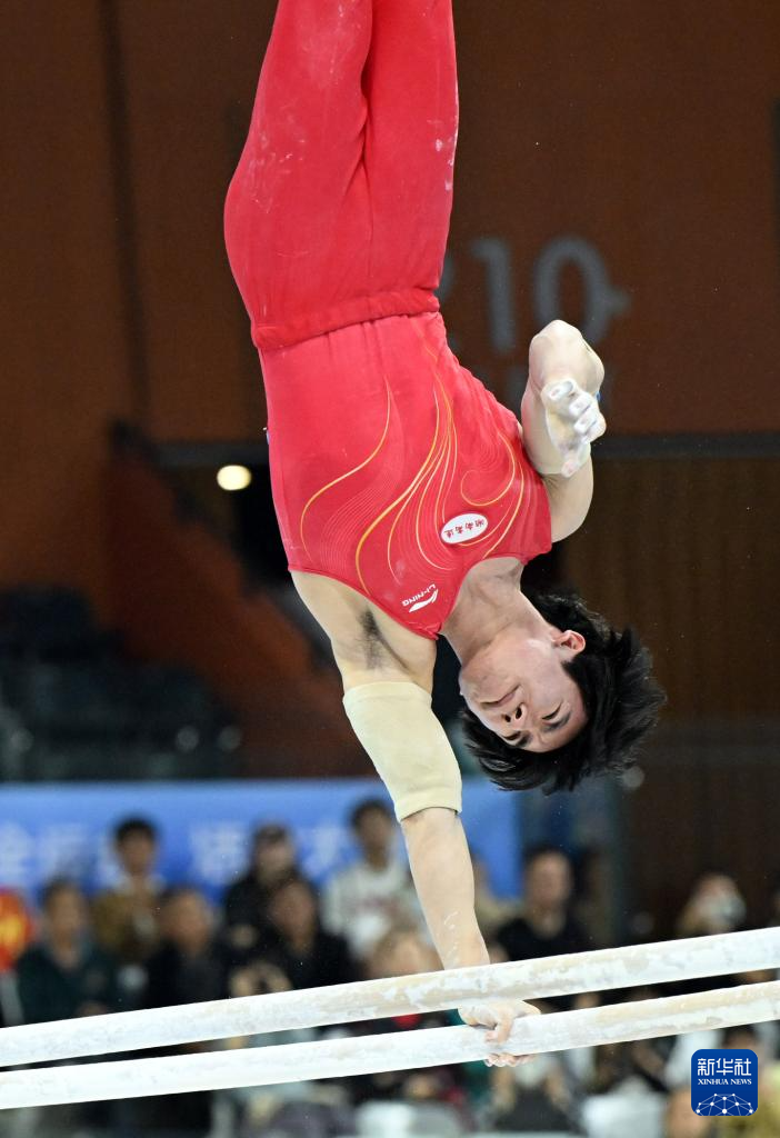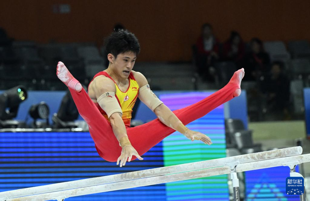 当日,第十五届全国运动会体操项目男子双杠决赛在广东肇庆举行。
