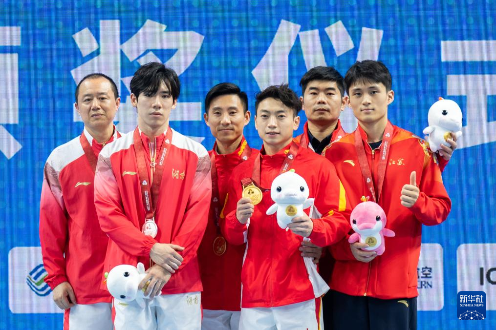 11月17日,获得冠军的四川队选手邹敬园(右三)、获得亚军的湖南队选手张博恒(左二)、获得季军的江苏队选手侍聪(右一)在颁奖仪式上与教练合影。
