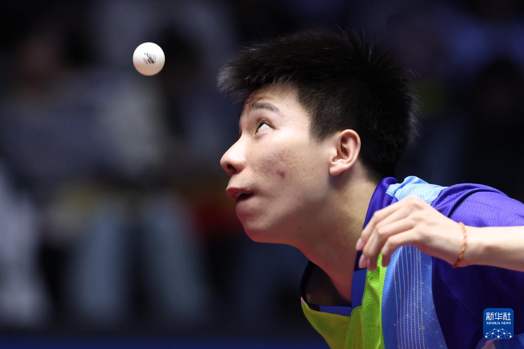 11月18日,上海队选手樊振东在比赛中发球。他对阵黑龙江队选手徐瑛彬。