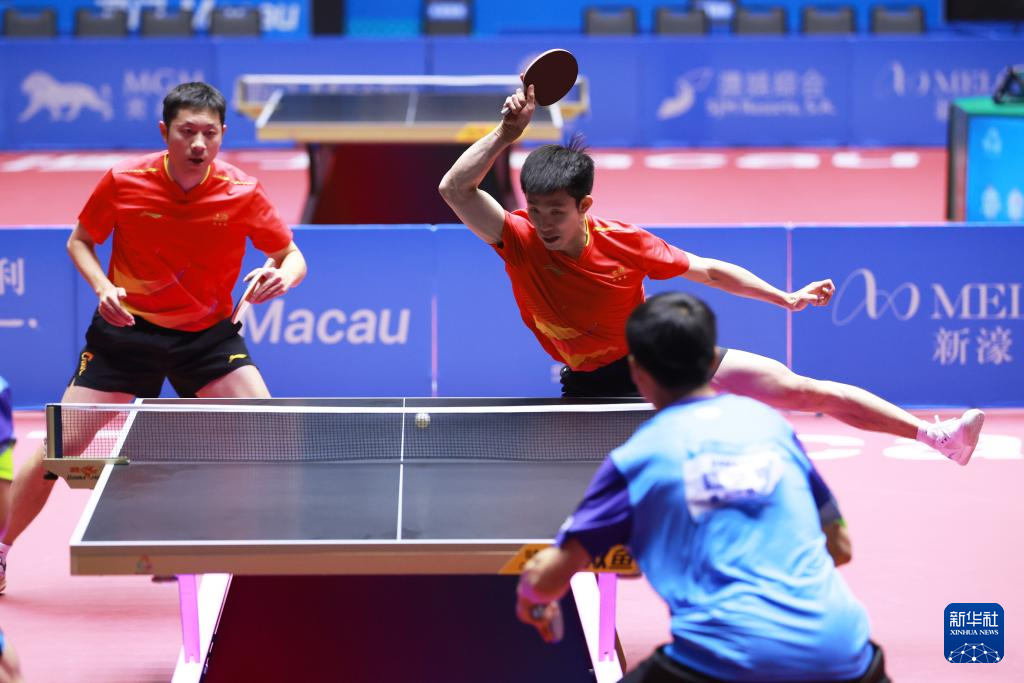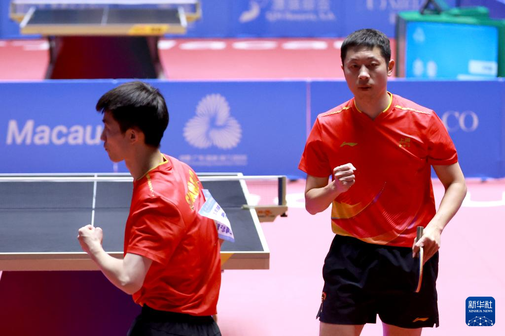 11月18日,上海队组合许昕(右)/周恺在比赛中庆祝得分。