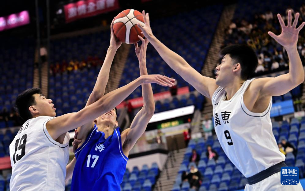 11月19日,上海队球员郭丰玮(中)在比赛中与广东队球员武子涵(右)、徐昕拼抢。