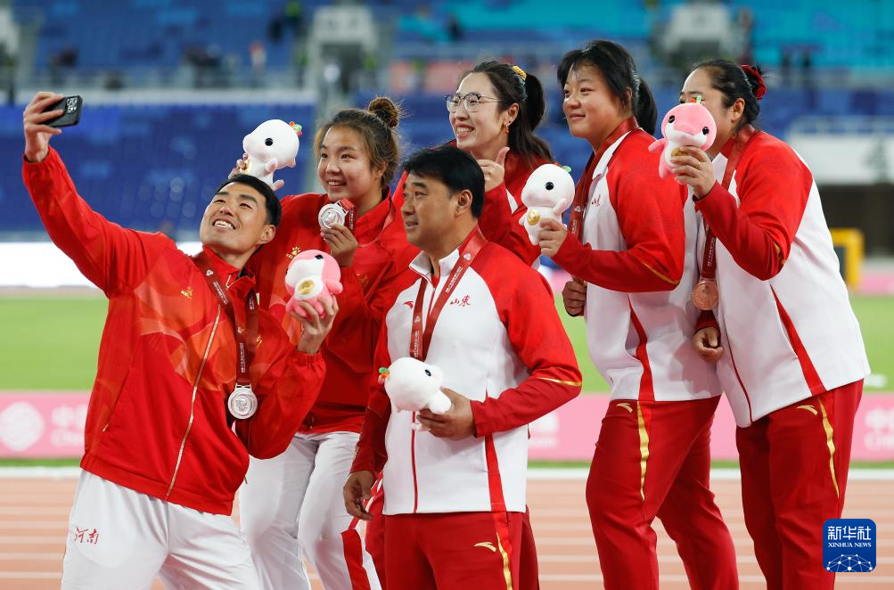 11月19日,获得冠军的山东队选手冯彬(右三)、获得亚军的河南队选手王芳(左二)、获得季军的山东队选手姜志超(右二)在颁奖仪式上与教练自拍合影。
