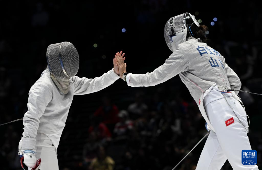 11月19日,山东队选手白文秀(右)和湖北队选手徐悦涵在比赛中击掌致意。