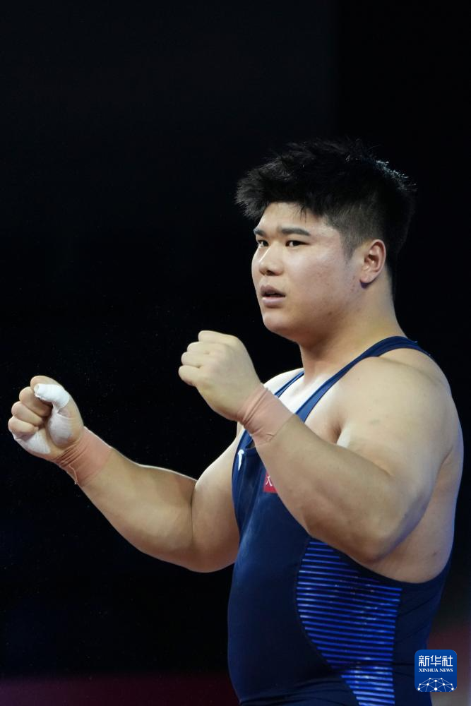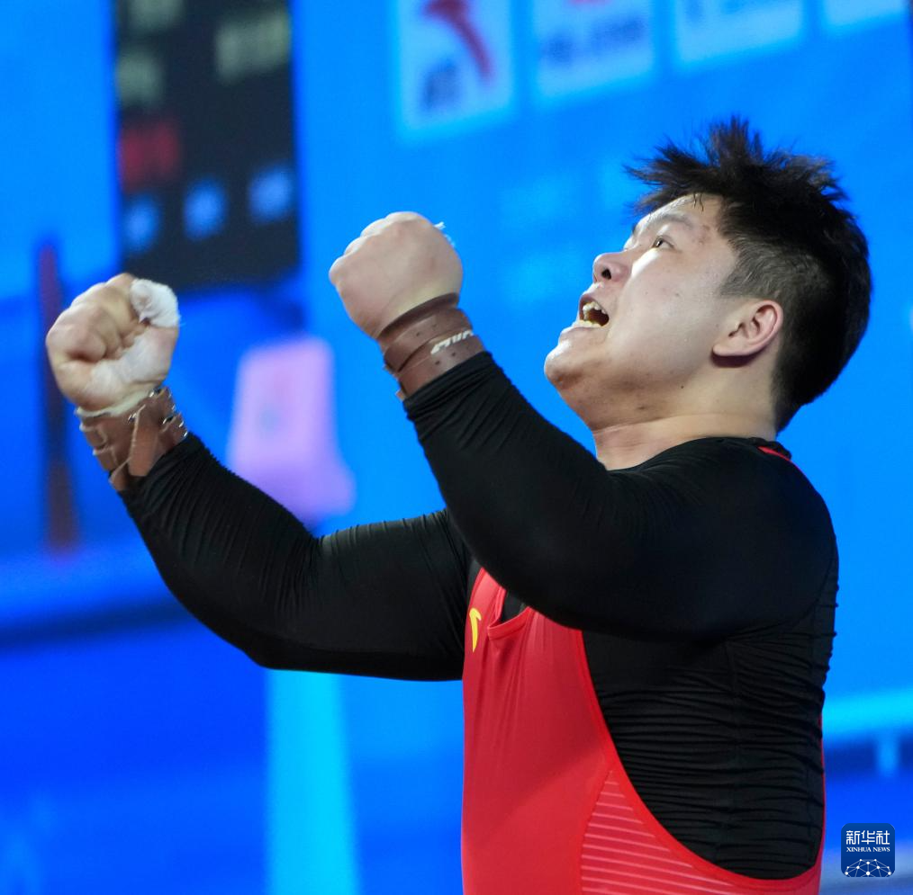 11月19日,辽宁队选手邹元清在挺举比赛中试举成功后庆祝。最终,他获得季军。