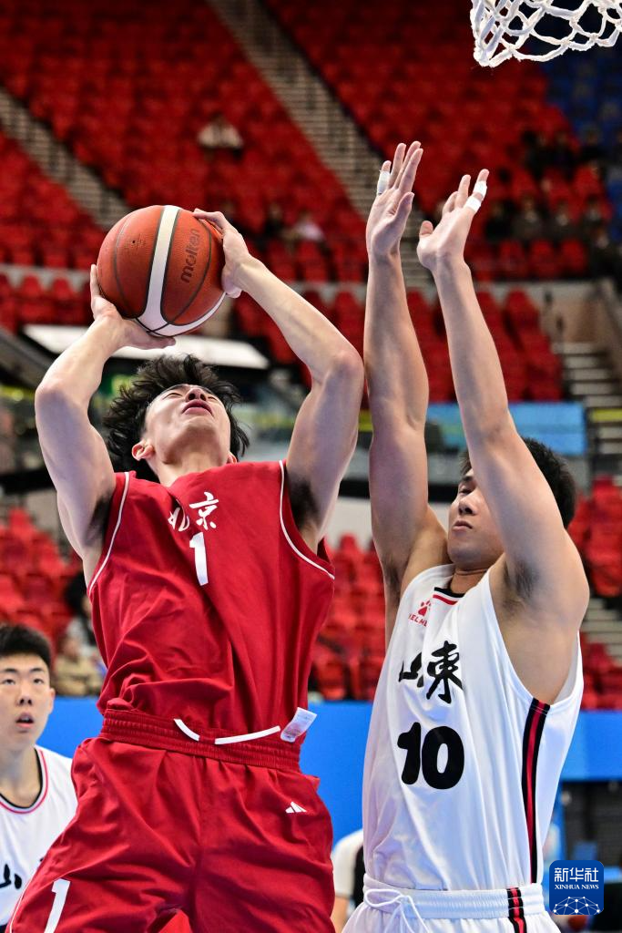 11月19日,北京队球员隰泰诚(左)突破山东队球员管子煜防守上篮。