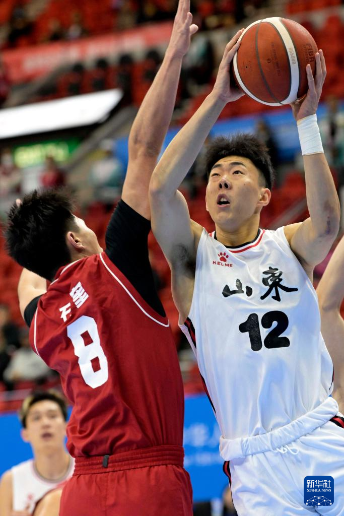 11月19日,山东队球员段昂君(右)在比赛中上篮。