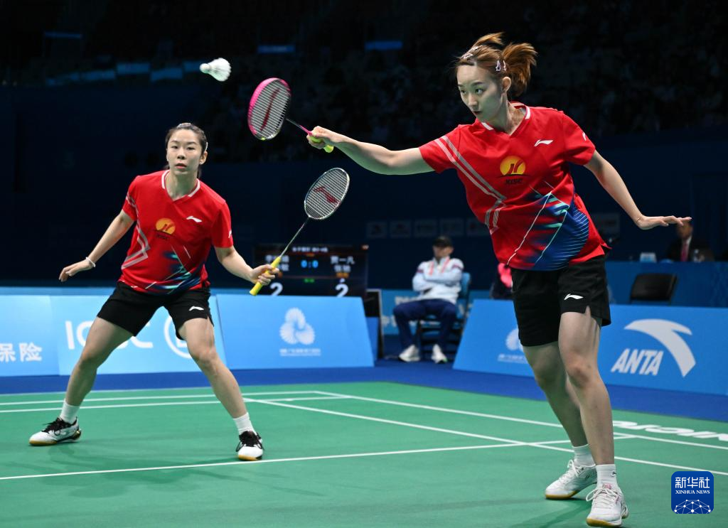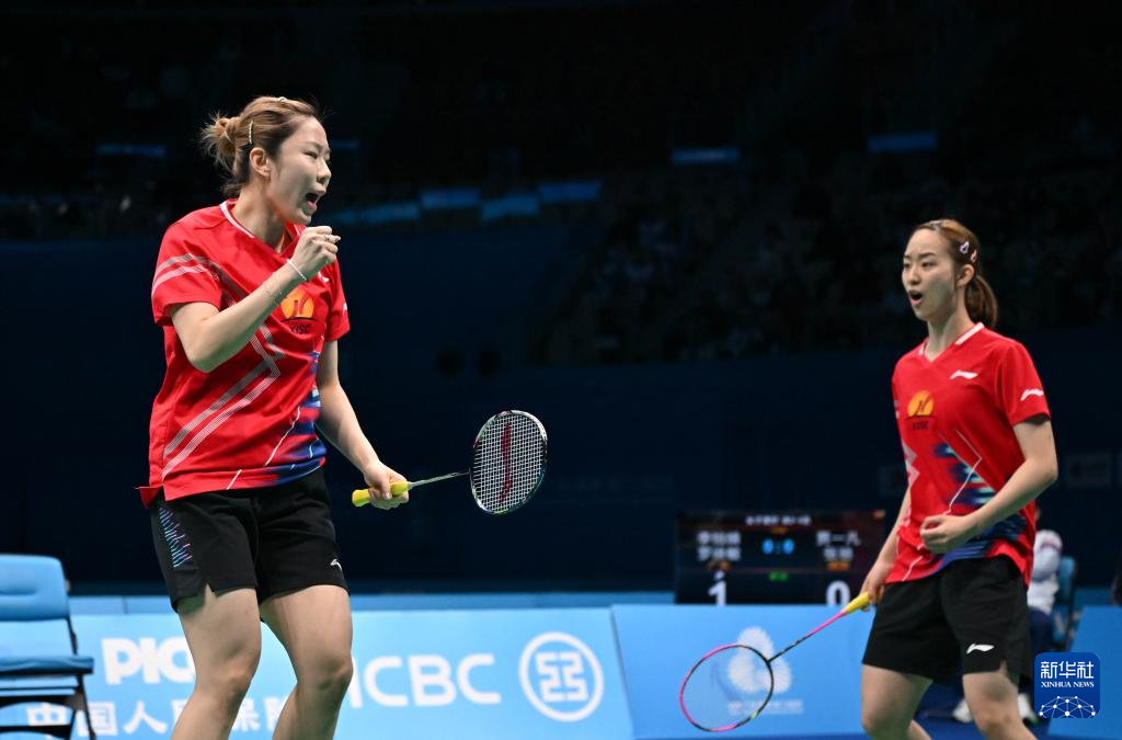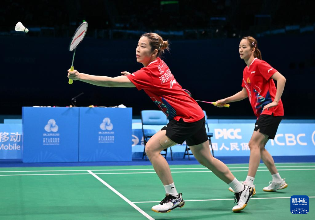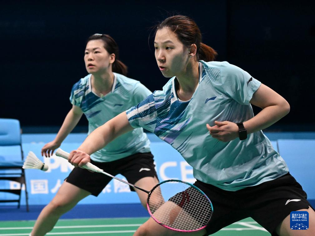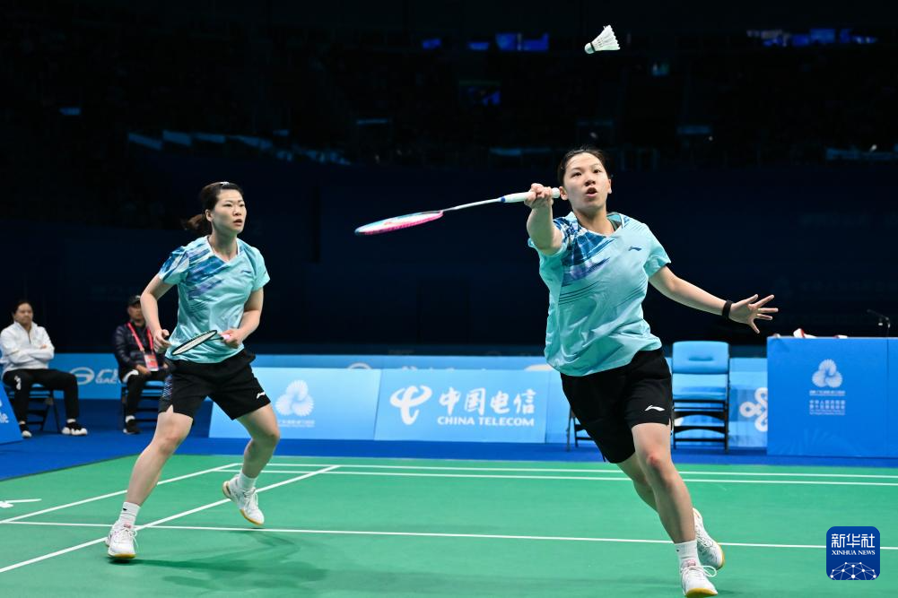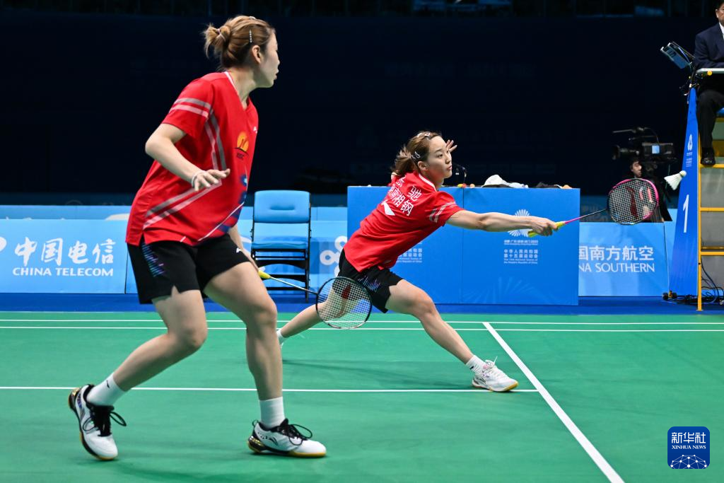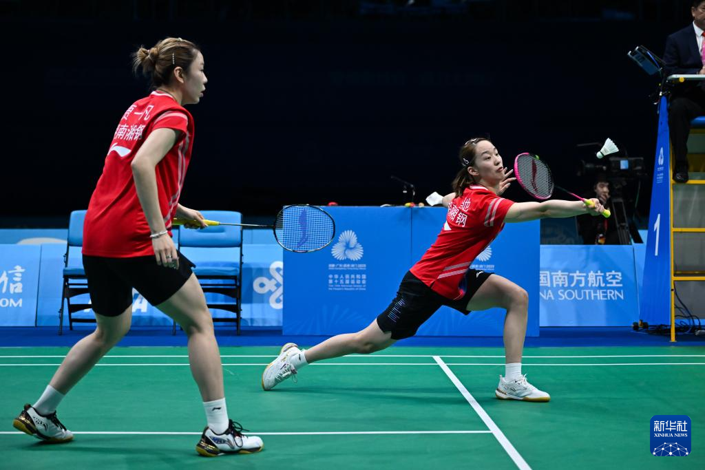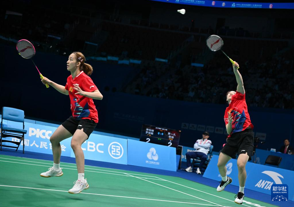 11月19日,广东队组合李怡婧(左)/罗徐敏在比赛中。
