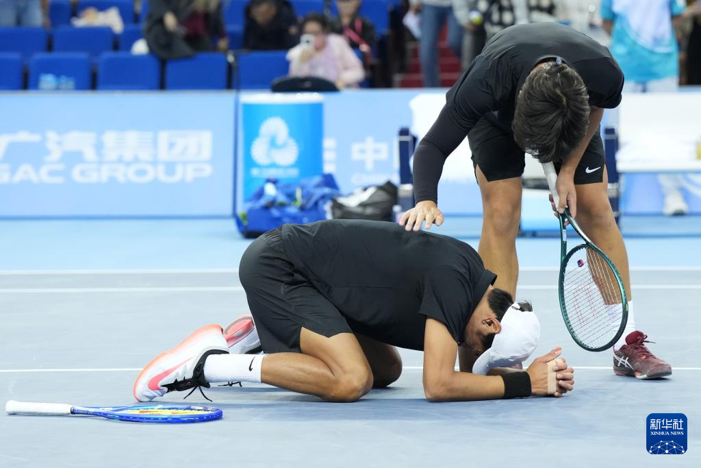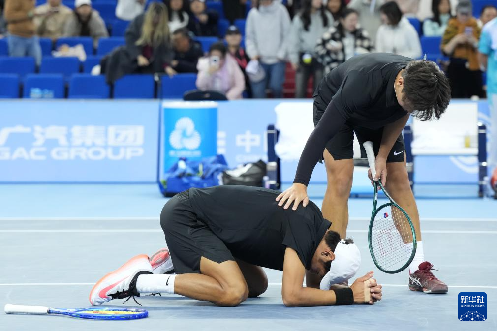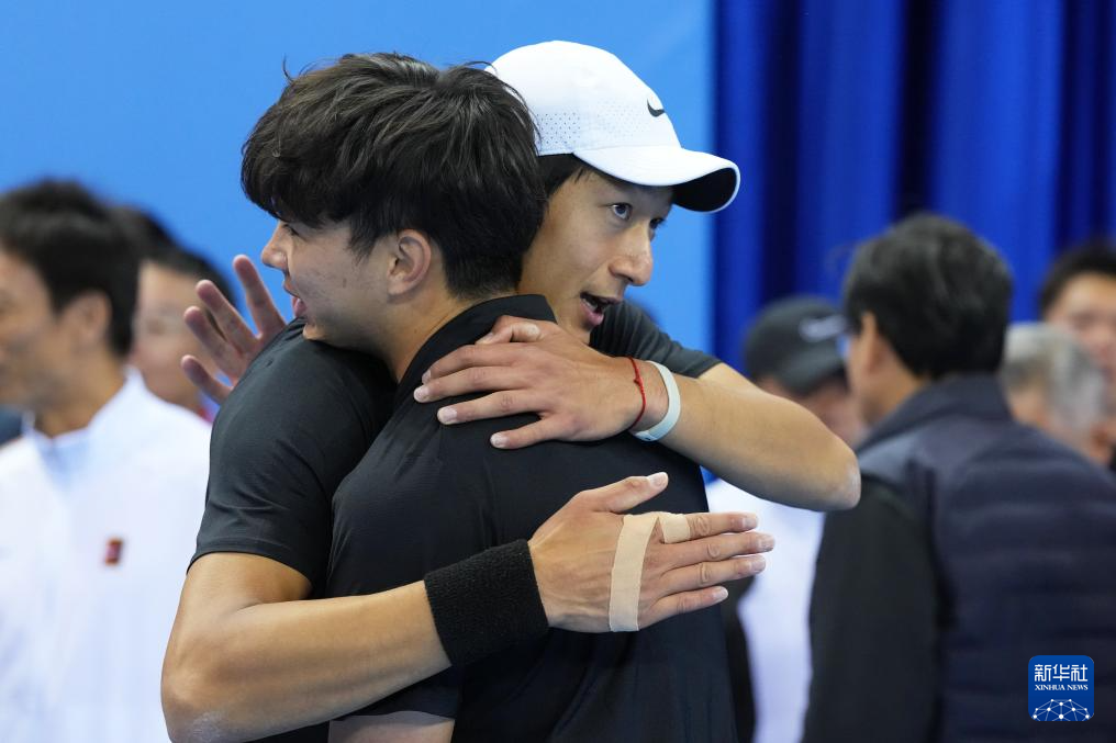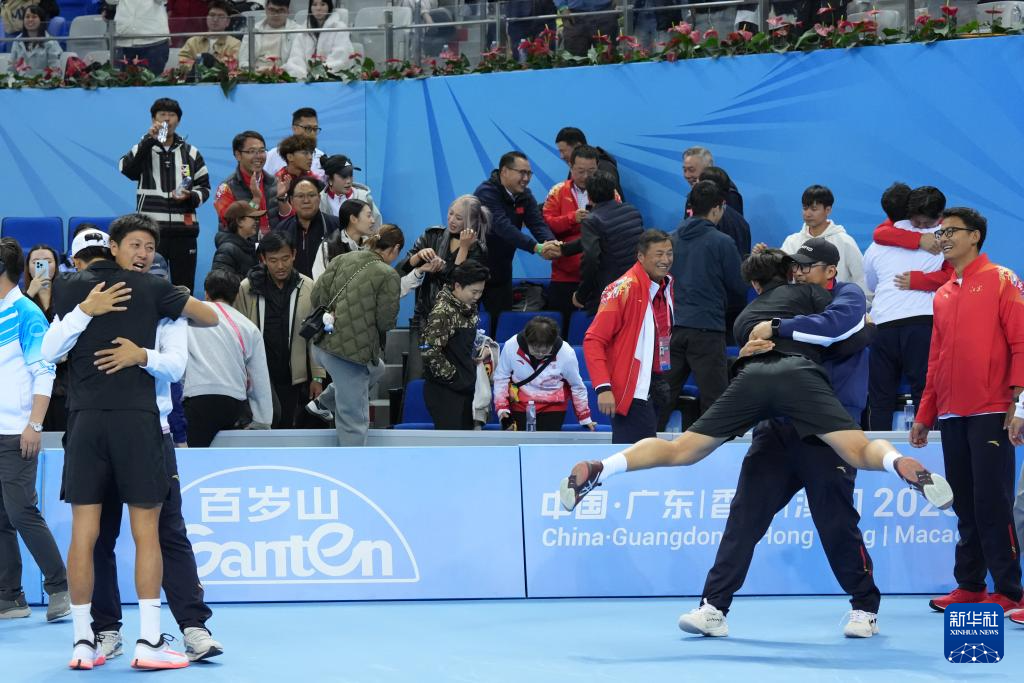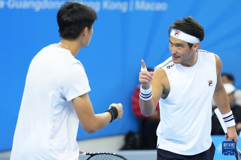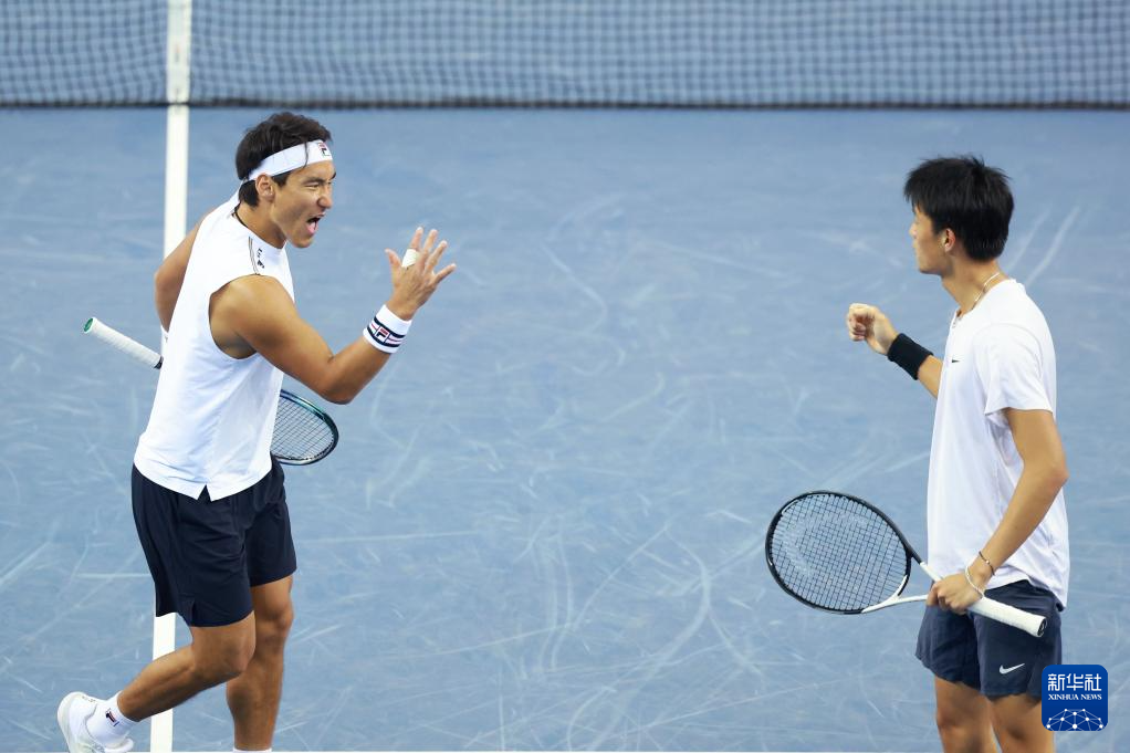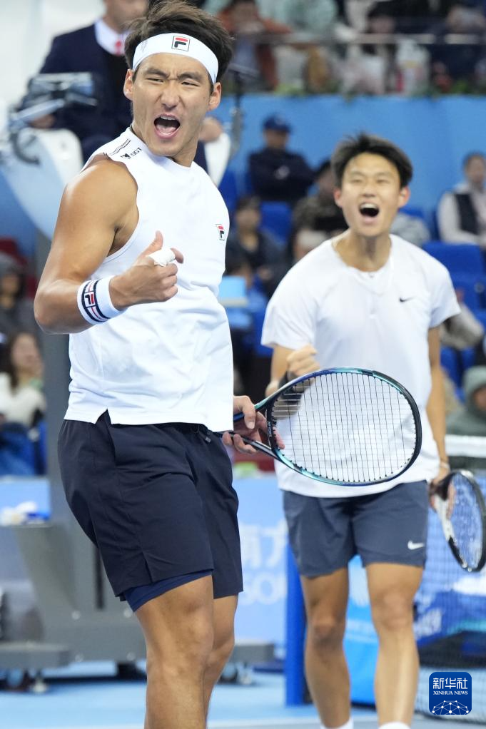 11月19日,浙江队组合布云朝克特(左)/郑展在赢下一盘后庆祝。