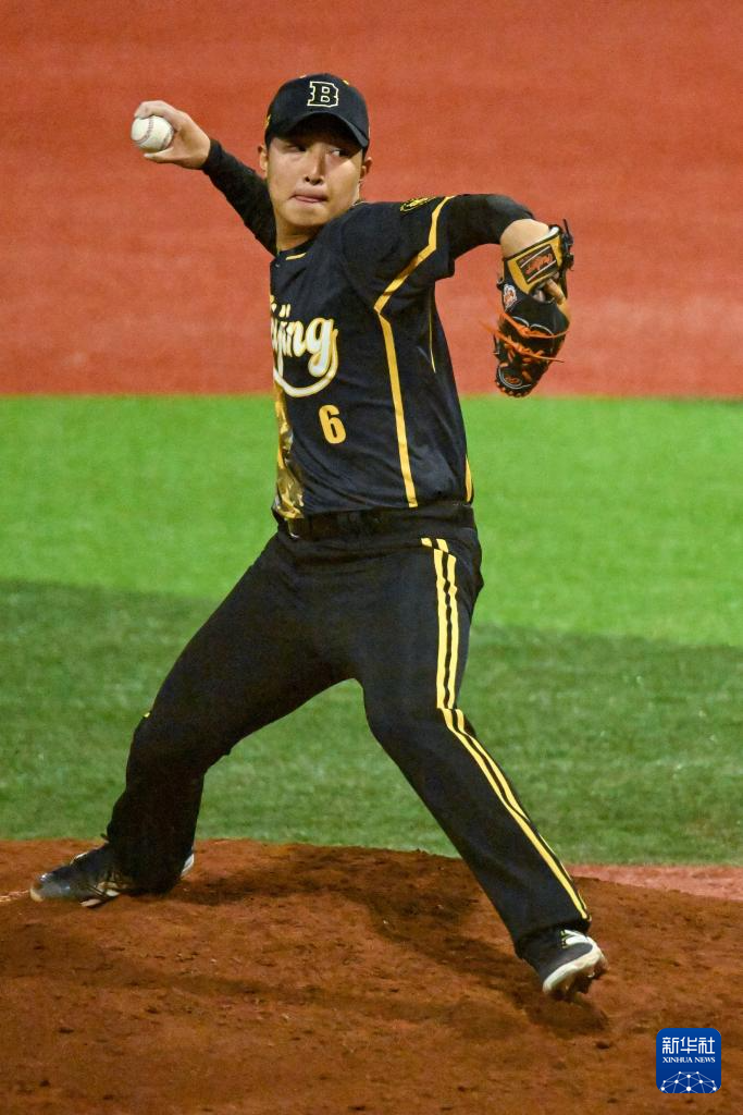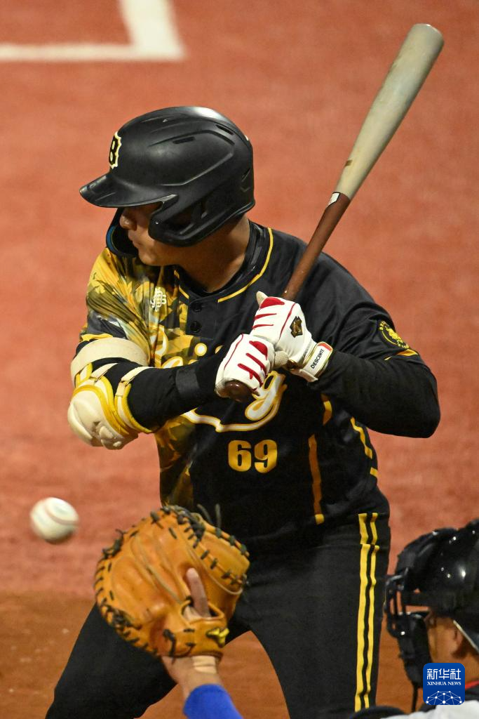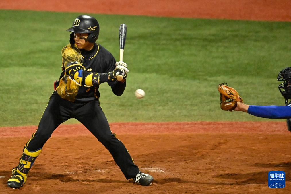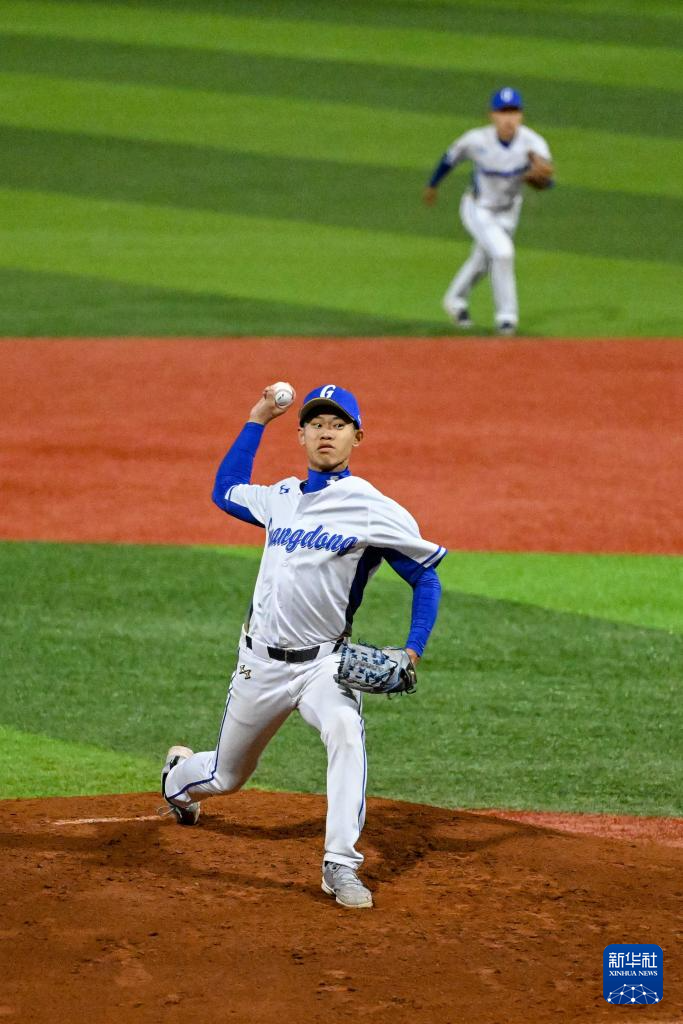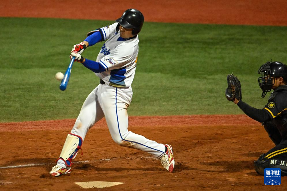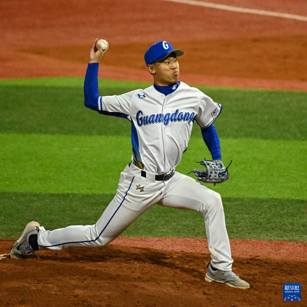 11月19日,广东队球员吴启锐在比赛中庆祝上垒。