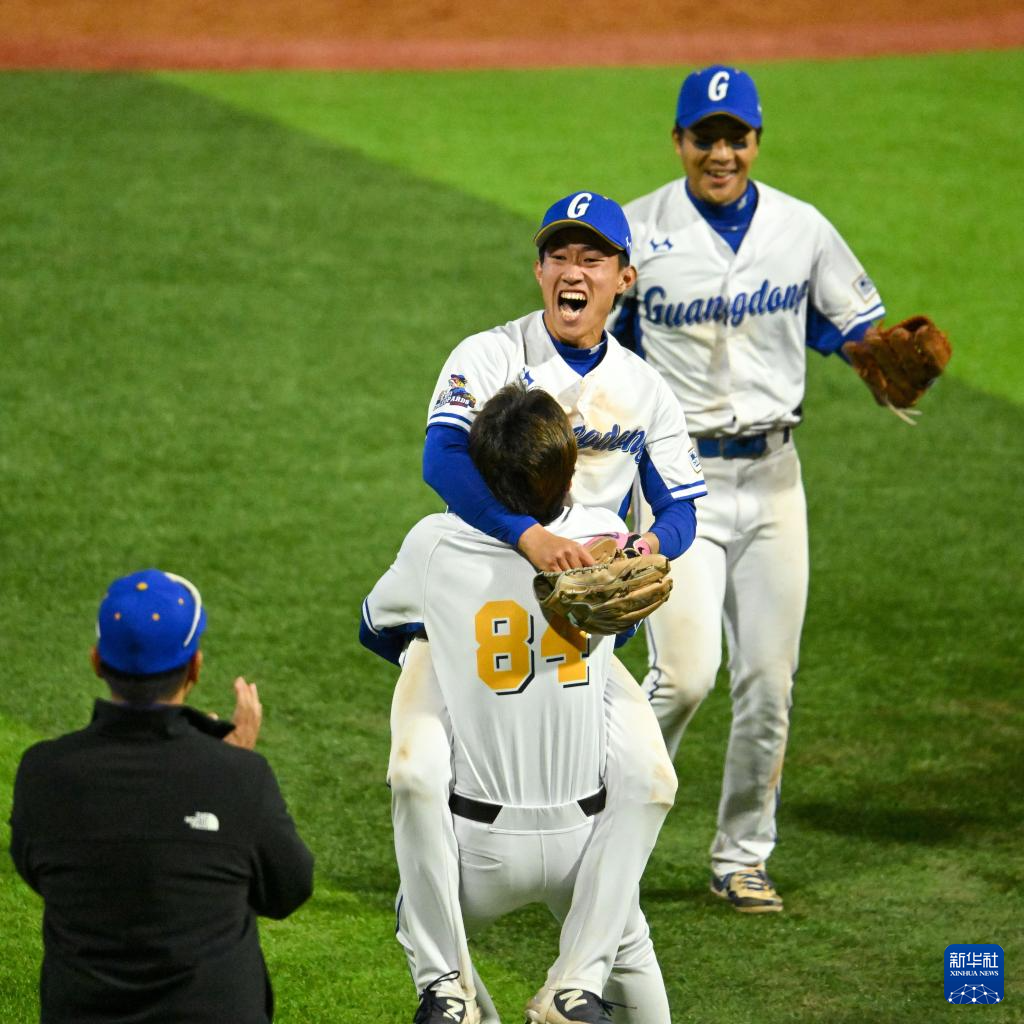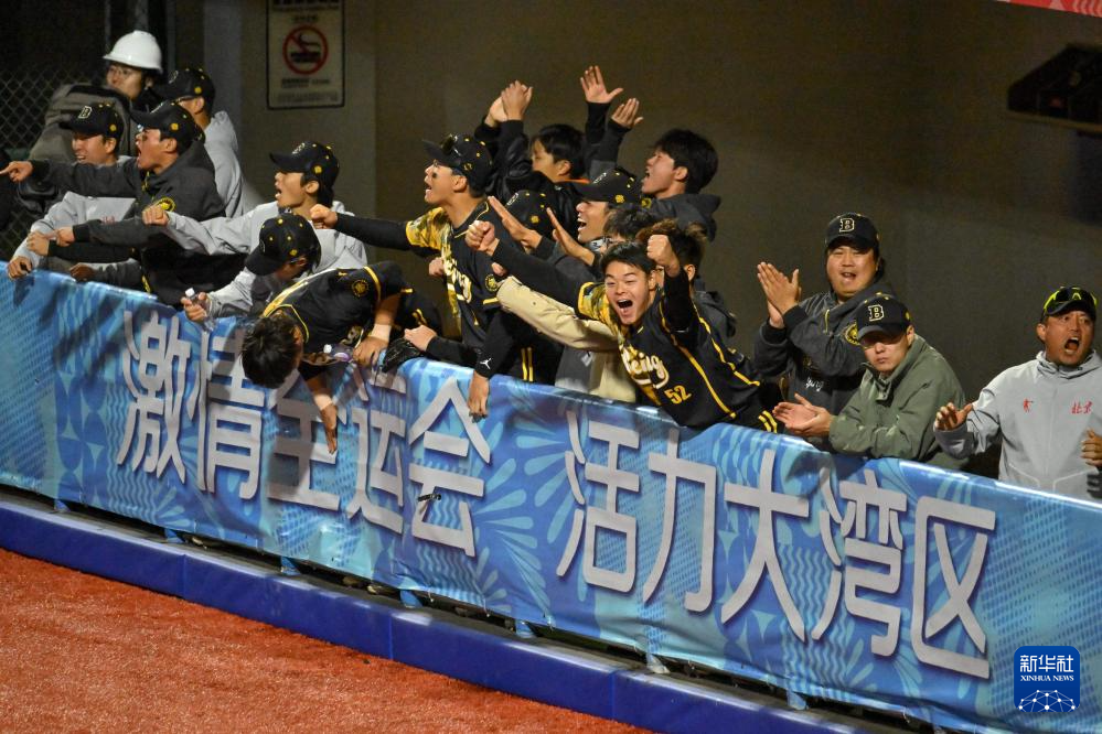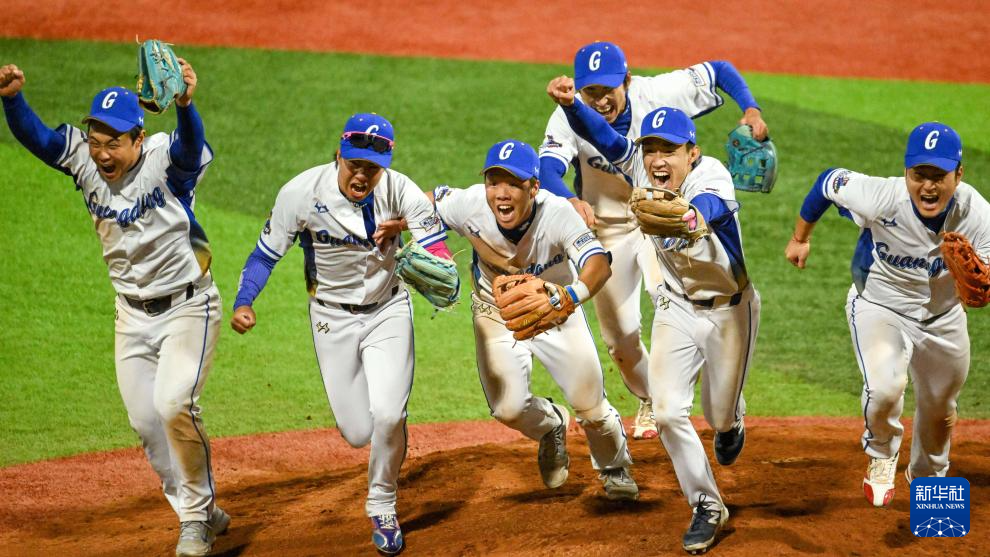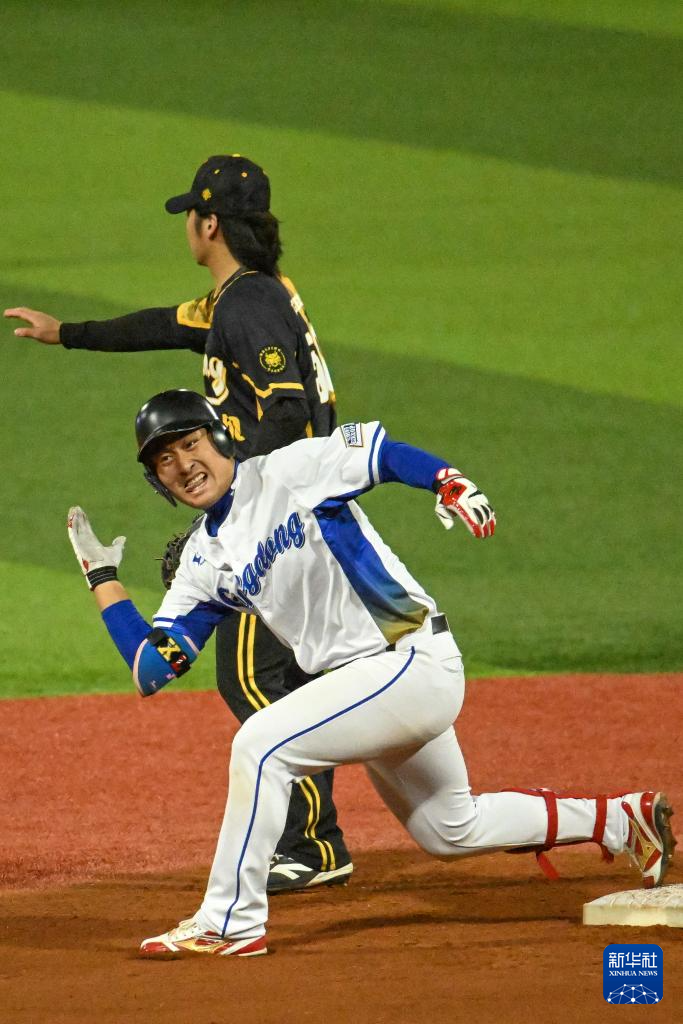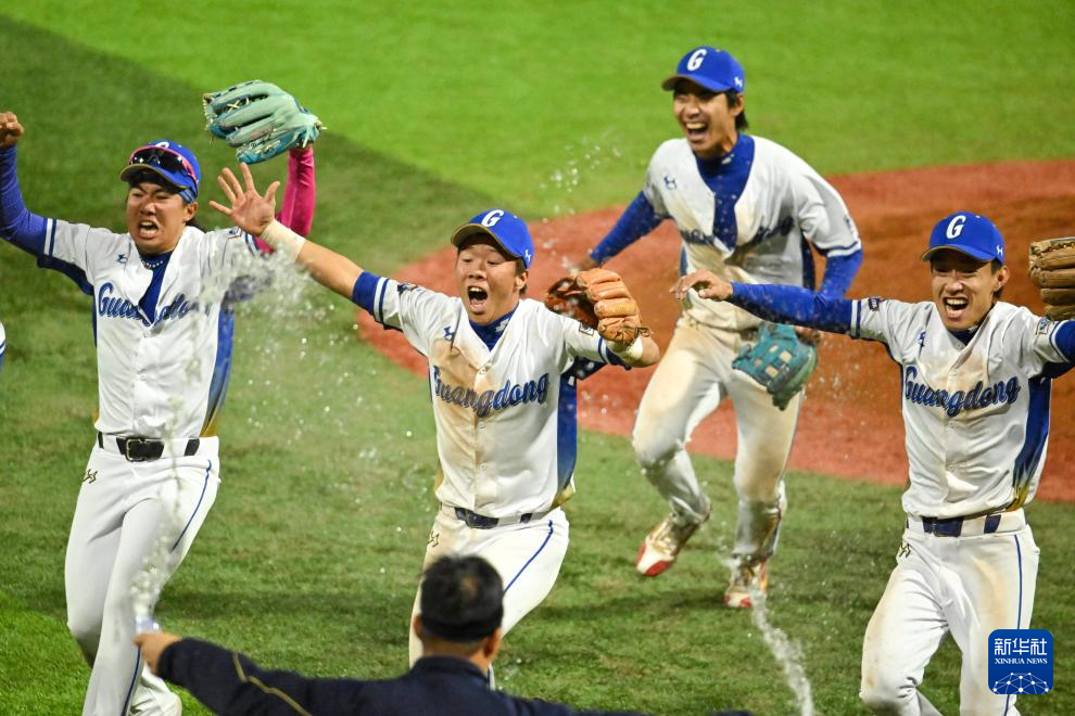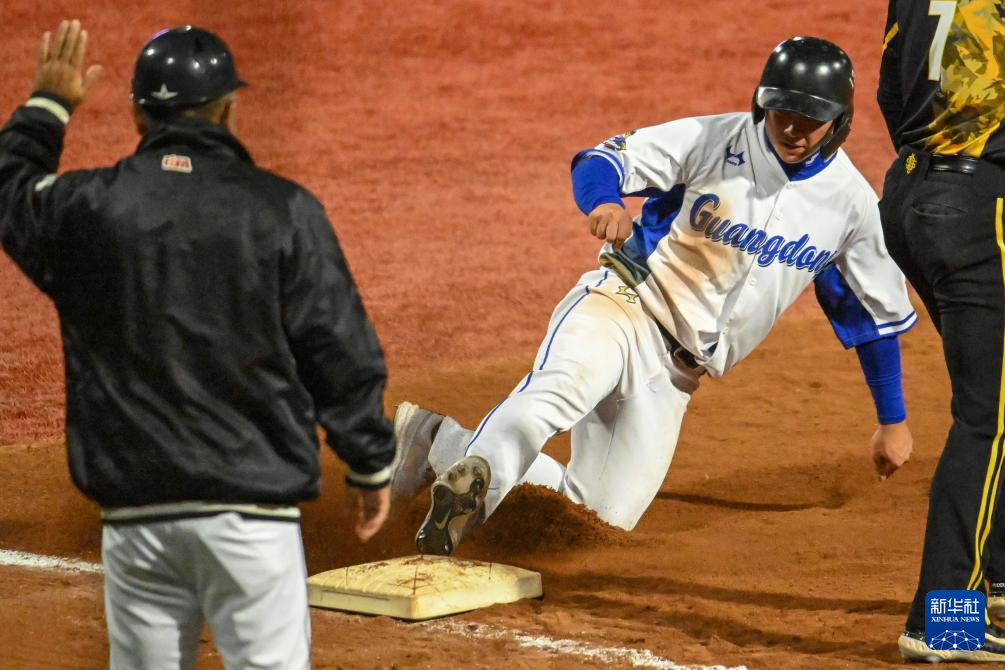 11月19日,广东队球员周奕(下)在比赛中庆祝上垒。
