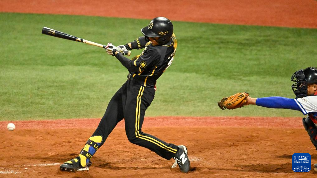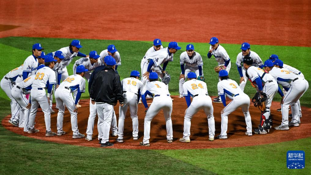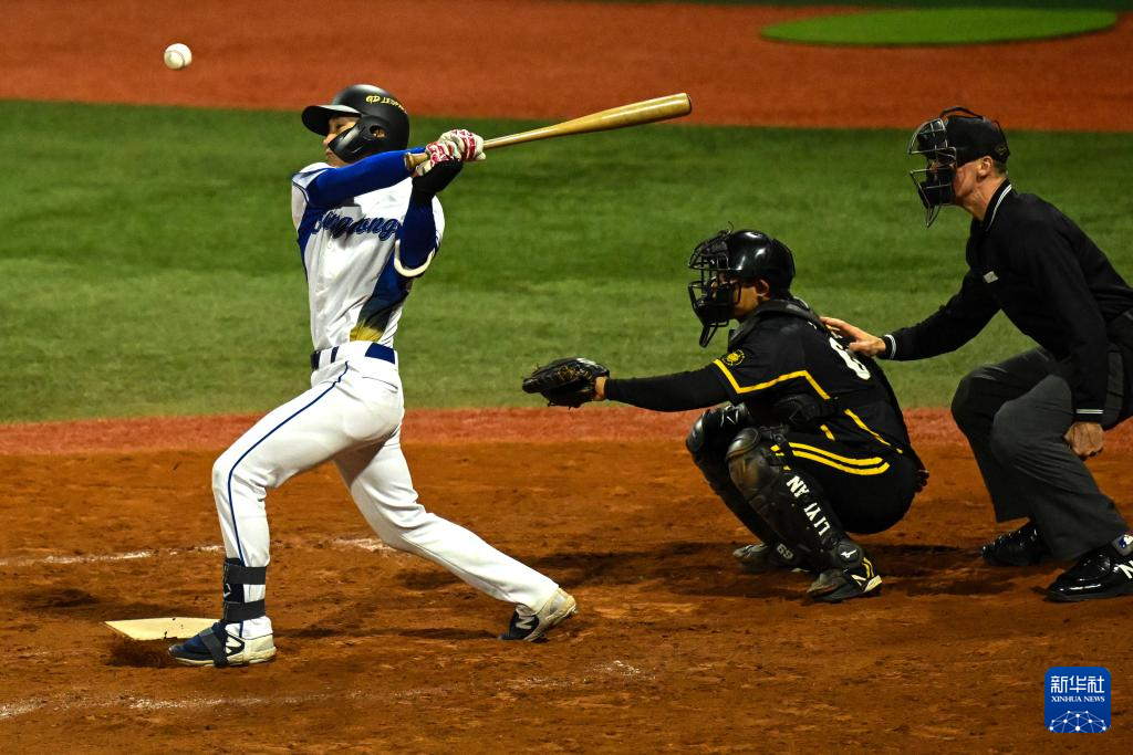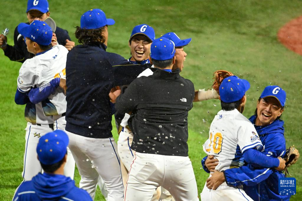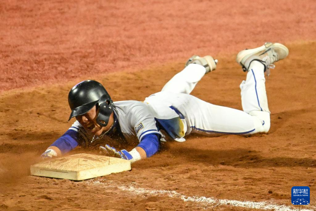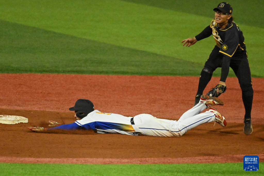 11月19日,广东队球员周奕(下)在比赛中庆祝上垒。