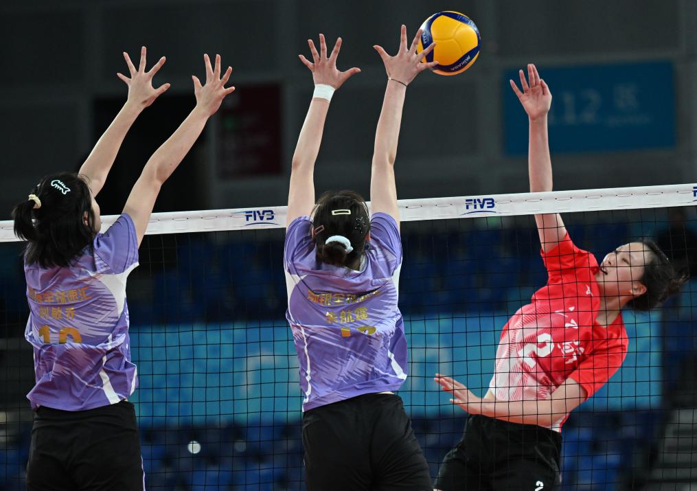 11月18日,江苏队球员范泊宁(右一)在比赛中进攻。新华社记者 陈钟昊 摄