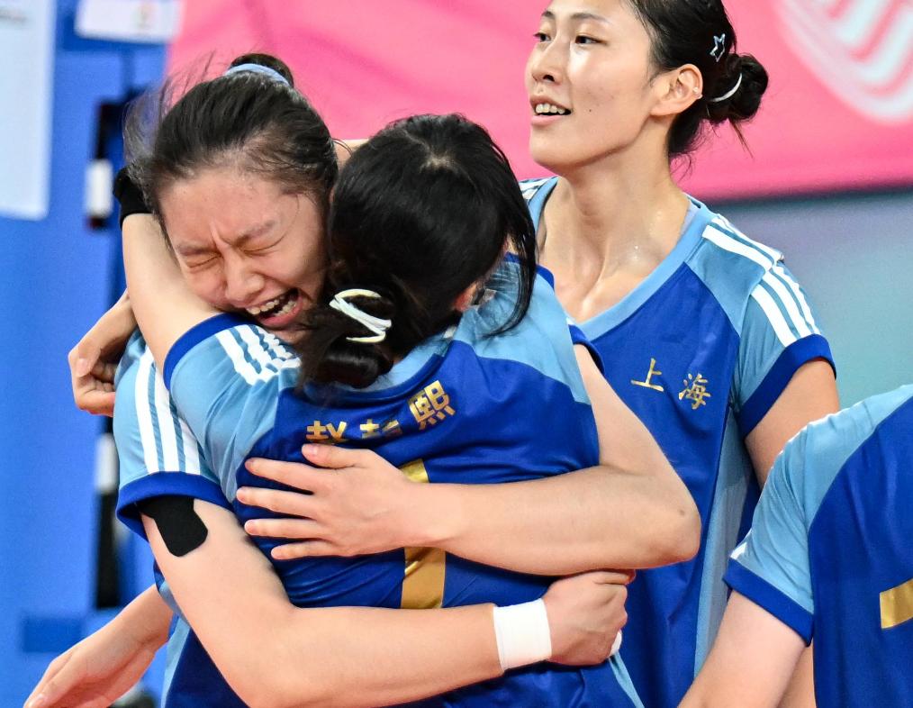 11月17日,上海队球员陈厚羽(左一)和队长赵喆熙在比赛胜利后相拥。新华社记者 陈钟昊 摄