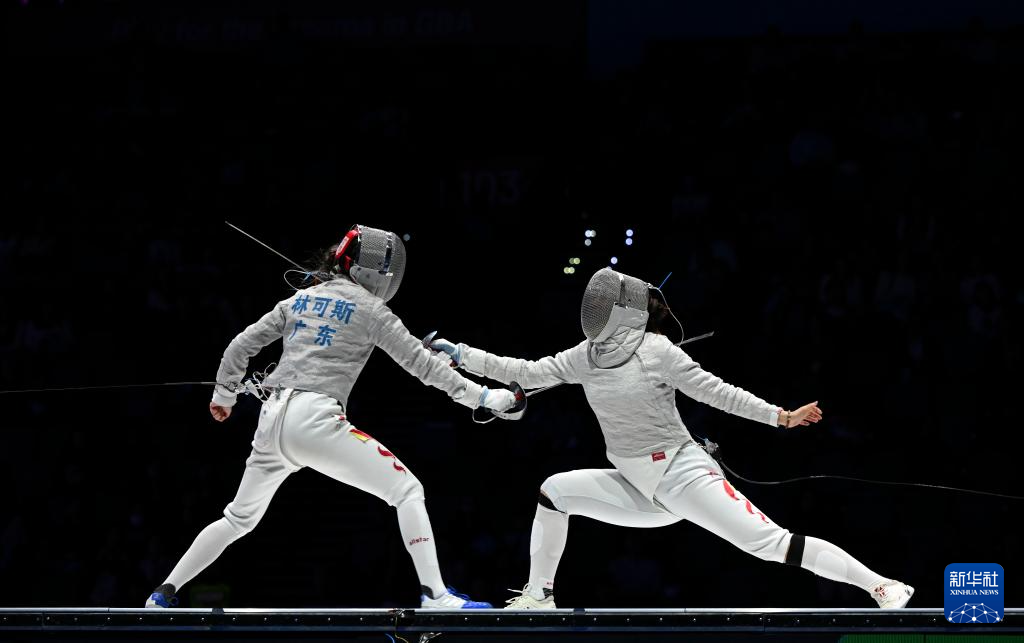 11月19日,广东队选手林可斯(左)与江苏队选手傅颖在比赛中。