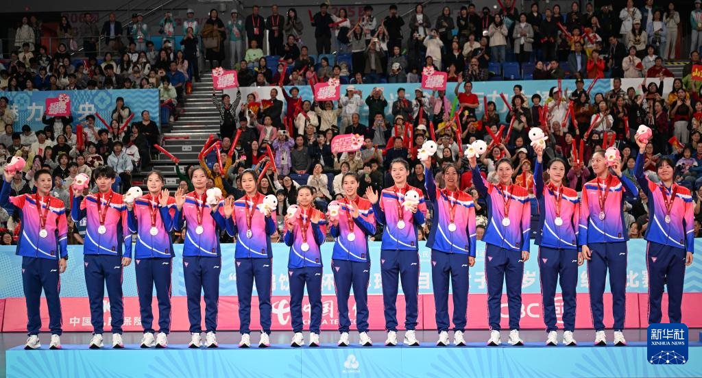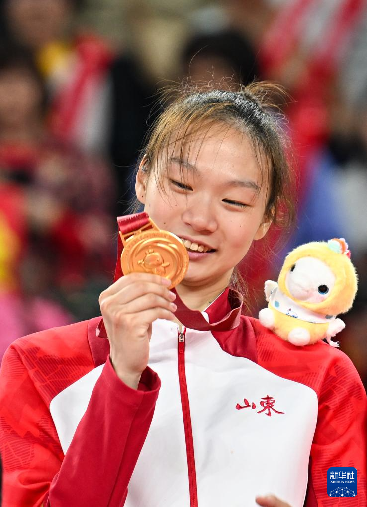 11月18日,山东队球员郭湘玲(中)在领奖台上咬金牌。