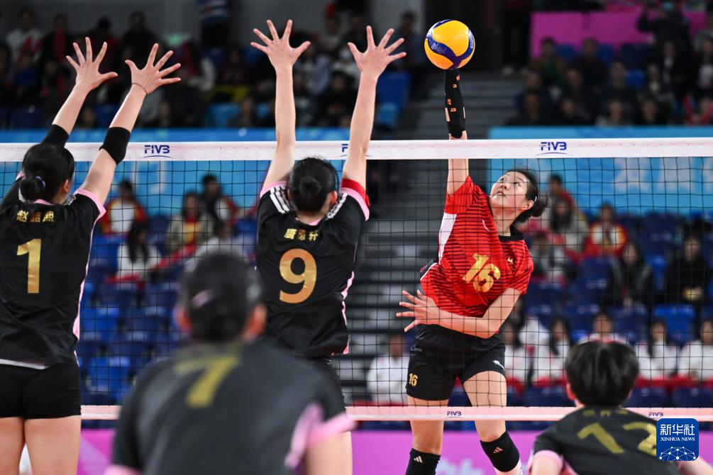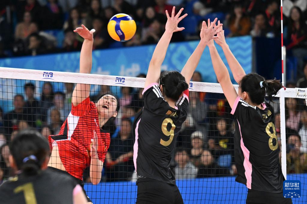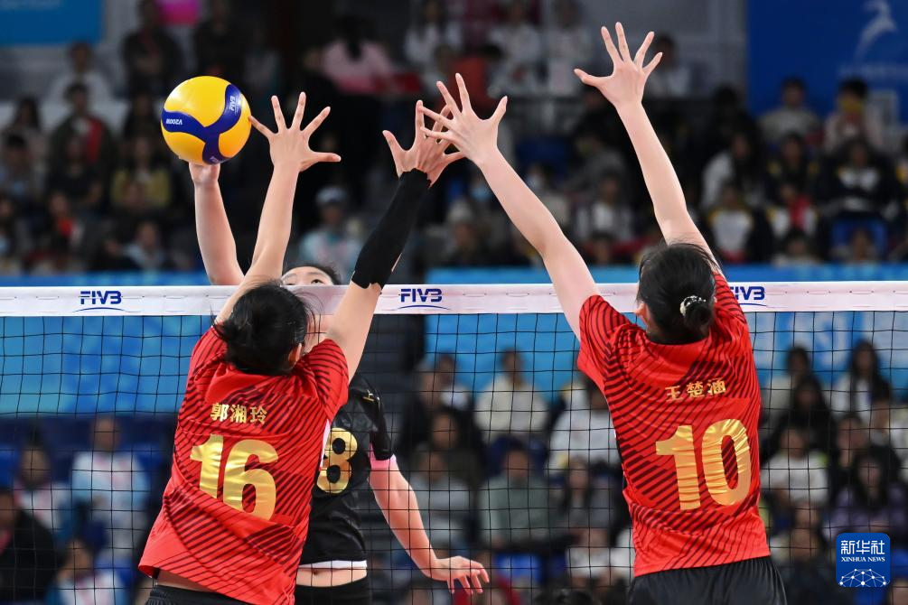 11月18日,山东队球员王楚涵(左)、李玥凝(中)拦网。