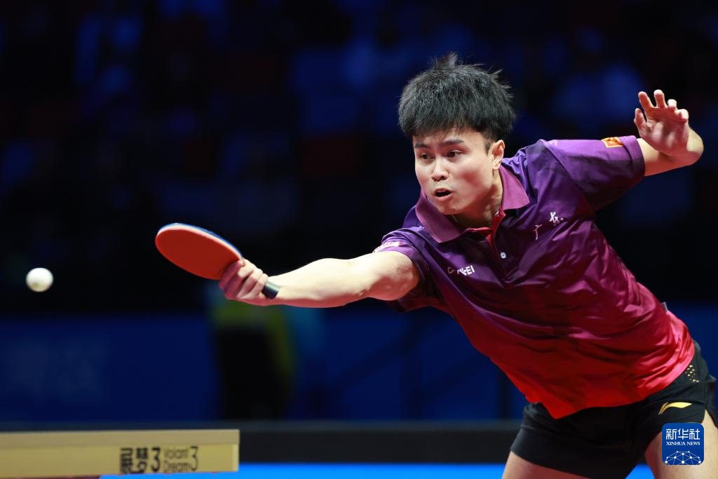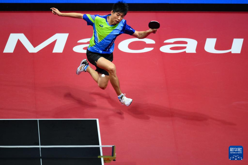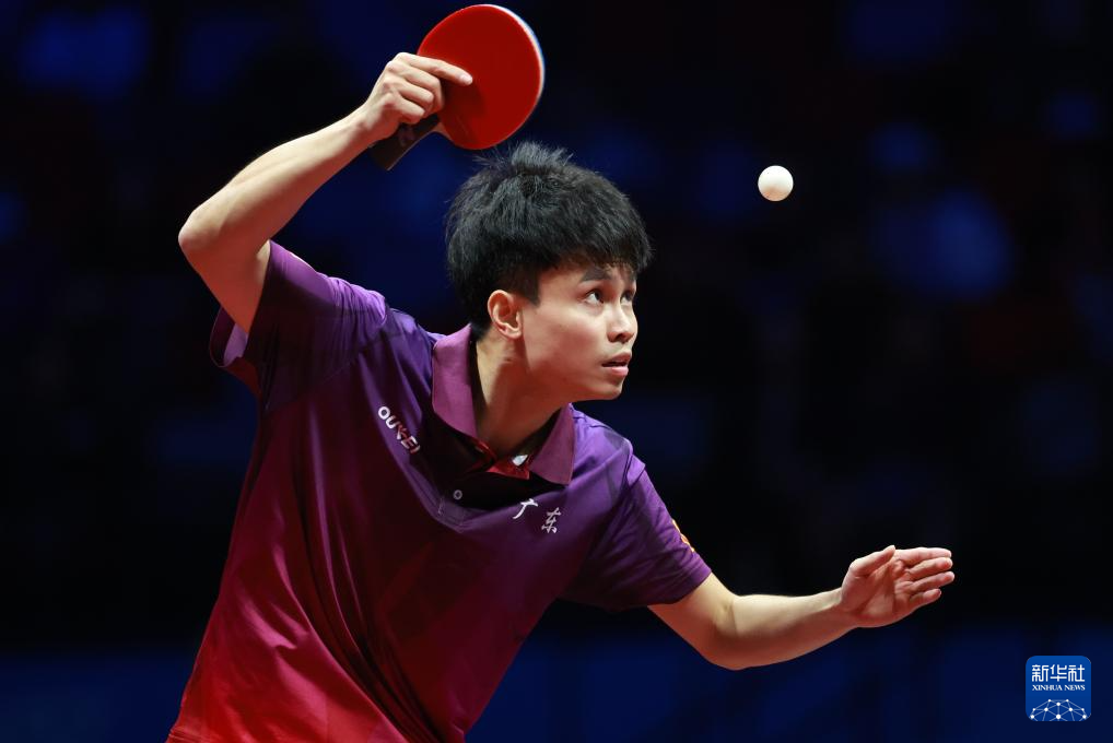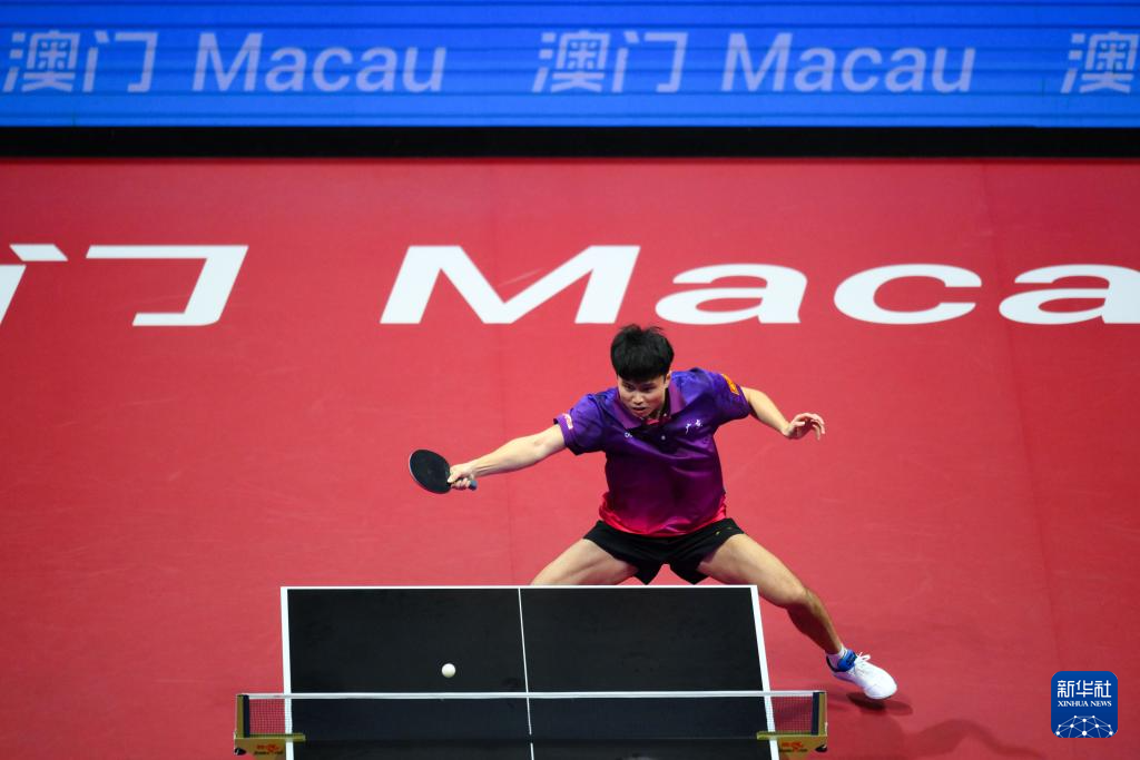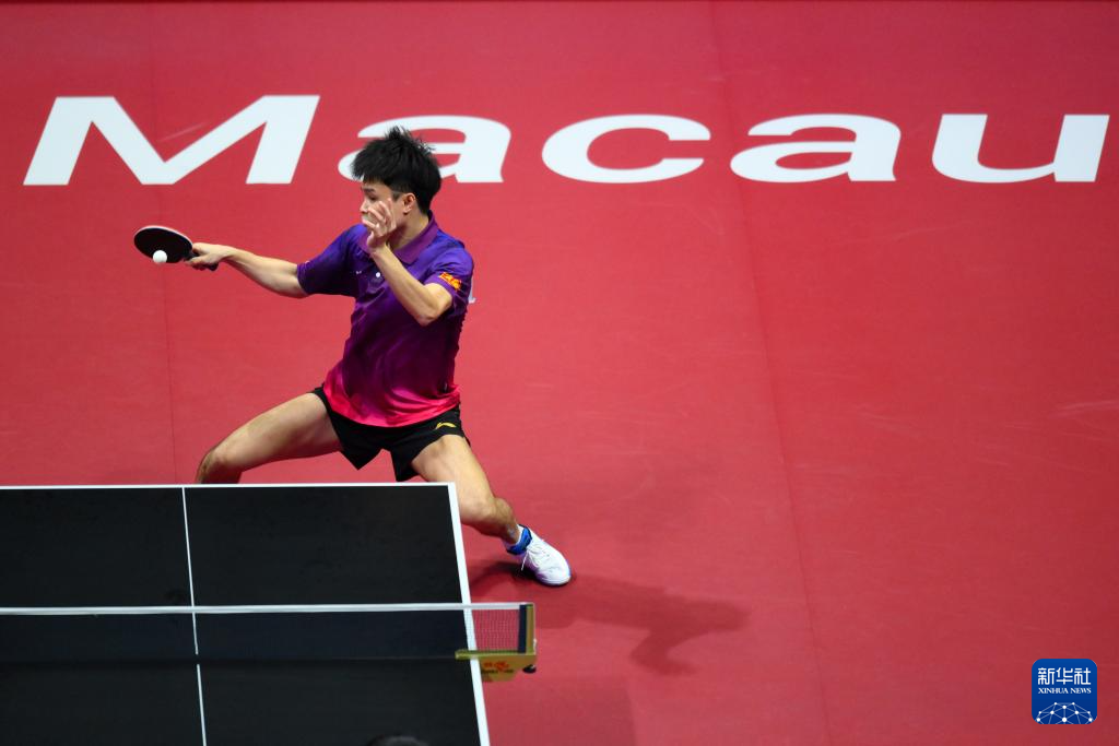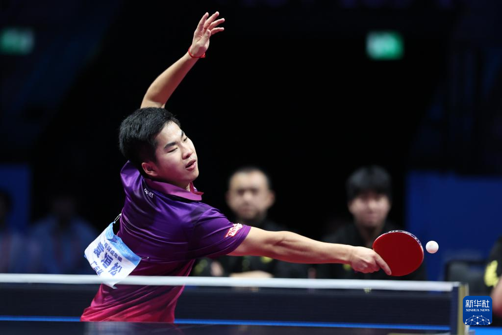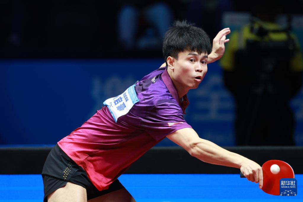 11月20日,广东队选手周启豪在比赛中回球,他3比1战胜黑龙江队选手魏世皓。