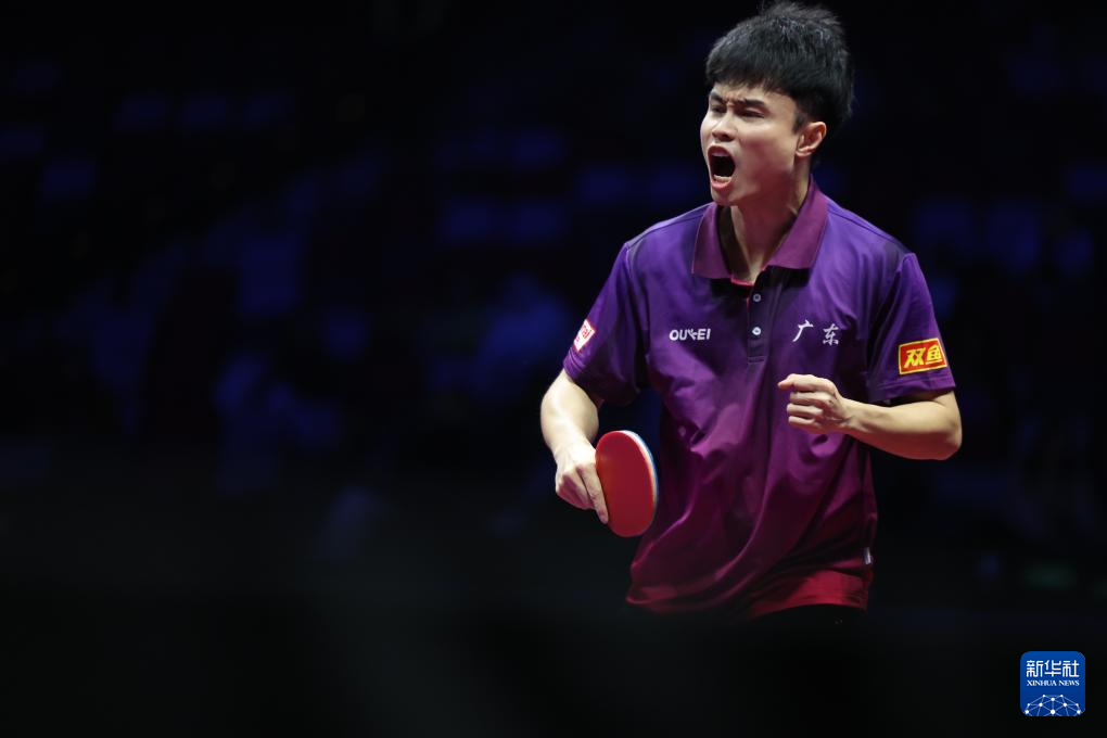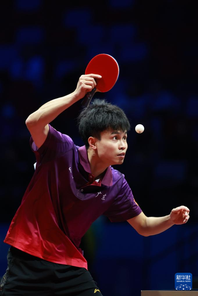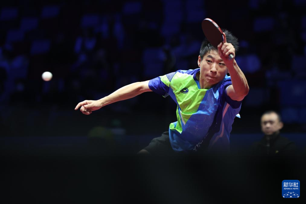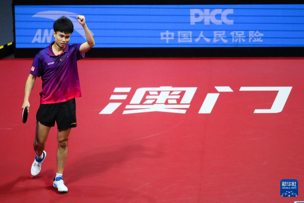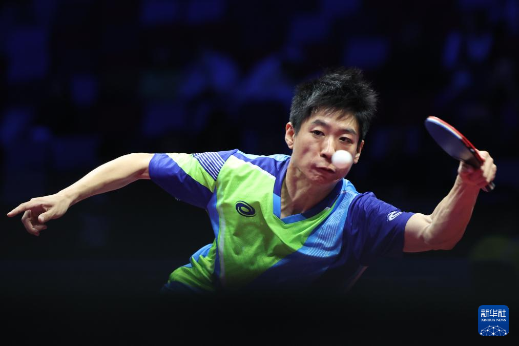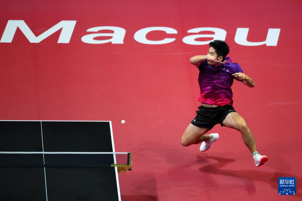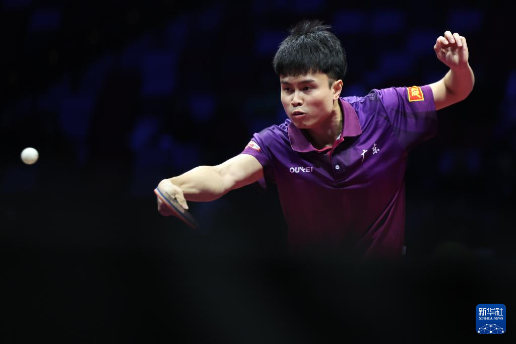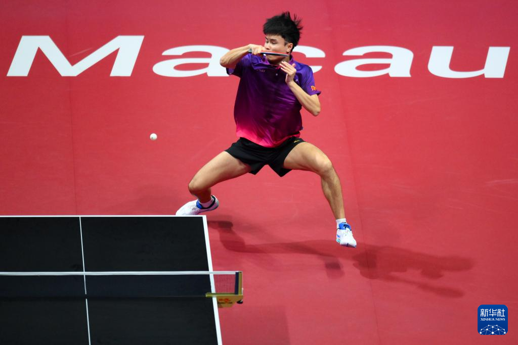 11月20日,广东队选手周启豪在比赛中回球,他3比1战胜黑龙江队选手魏世皓。