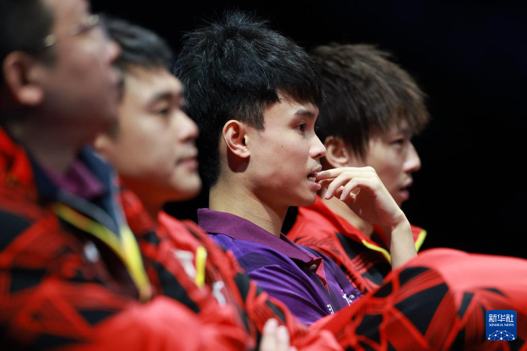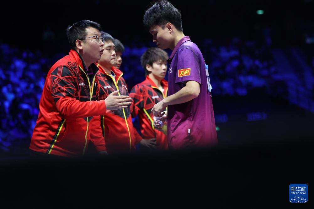 11月20日,广东队选手周启豪(右一)在比赛暂停时间与教练商量战术,他3比1战胜黑龙江队选手魏世皓。