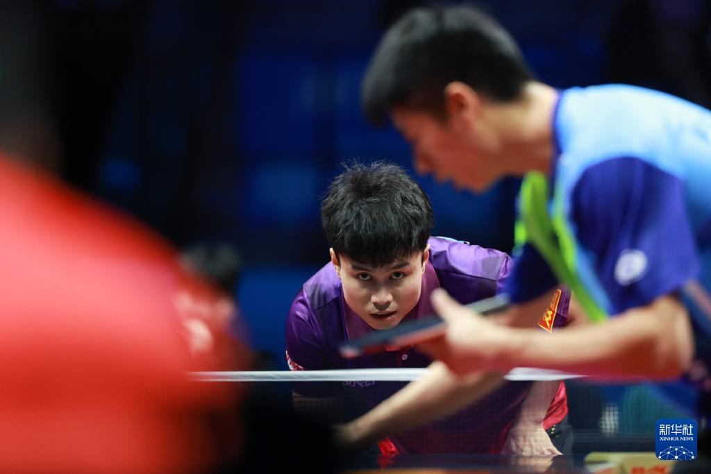 11月20日,广东队选手周启豪(左)在比赛中回球,他3比1战胜黑龙江队选手魏世皓。