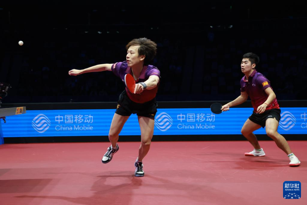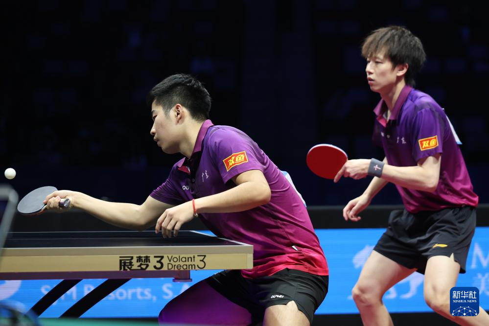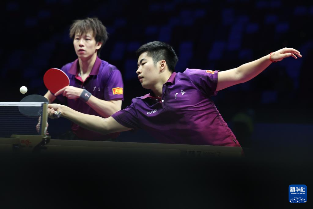 11月20日,黑龙江队选手徐瑛彬(左)/曹巍在比赛中,他们1比3不敌广东队选手林高远/袁烜松。
