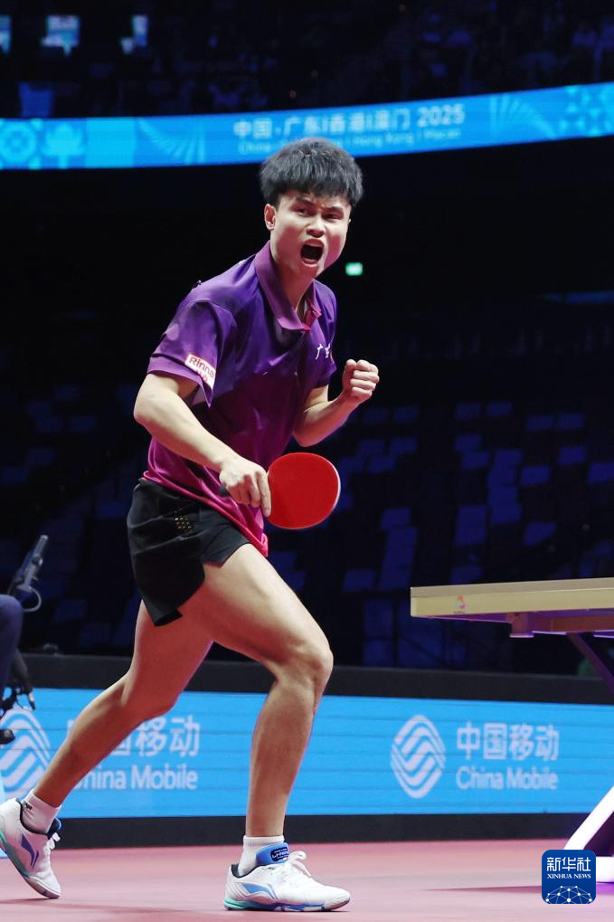 11月20日,广东队选手周启豪在比赛中庆祝得分,他3比1战胜黑龙江队选手魏世皓。