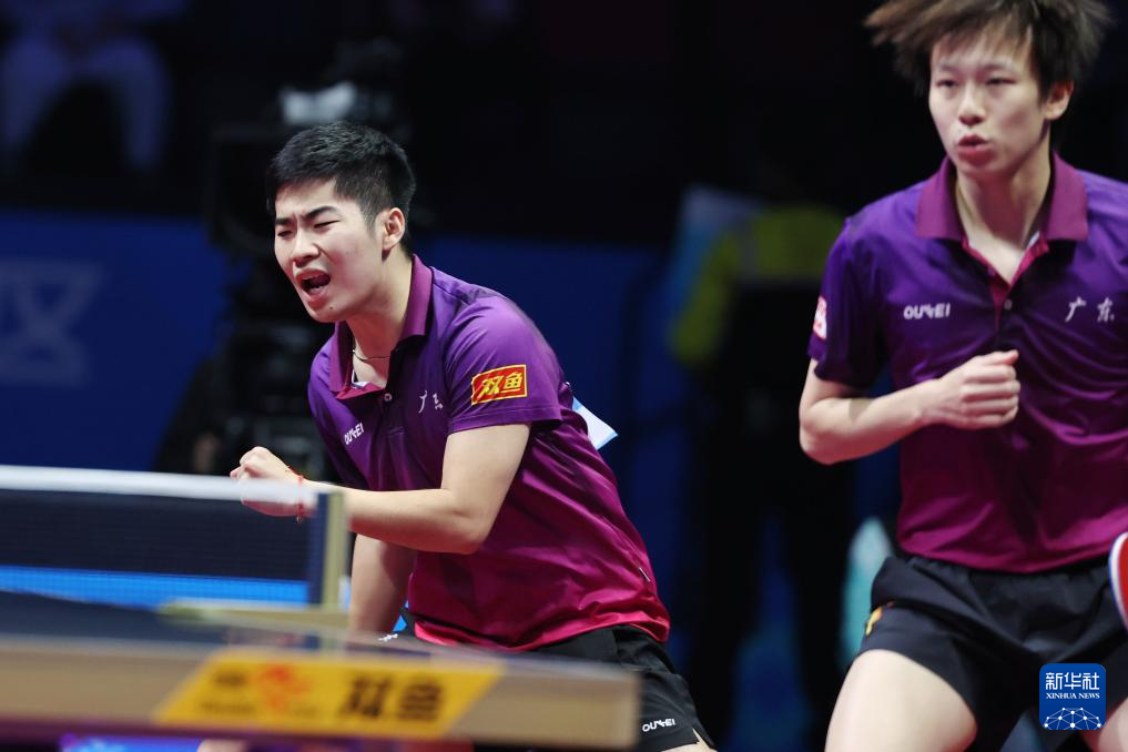 11月20日,广东队选手周启豪(左)在比赛中庆祝得分,他3比1战胜黑龙江队选手魏世皓。
