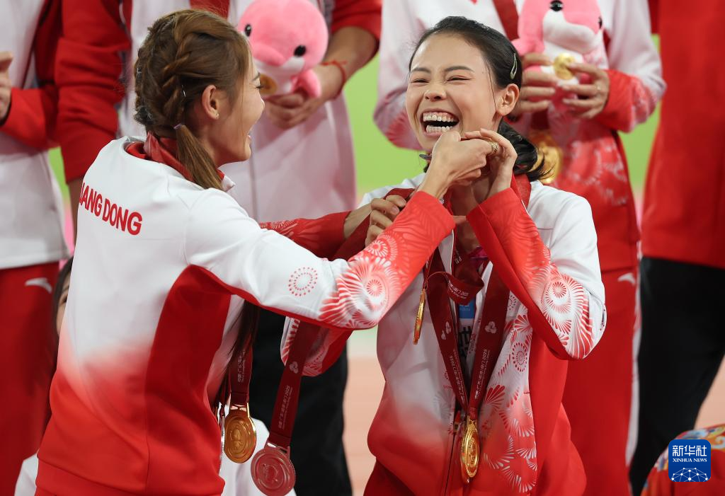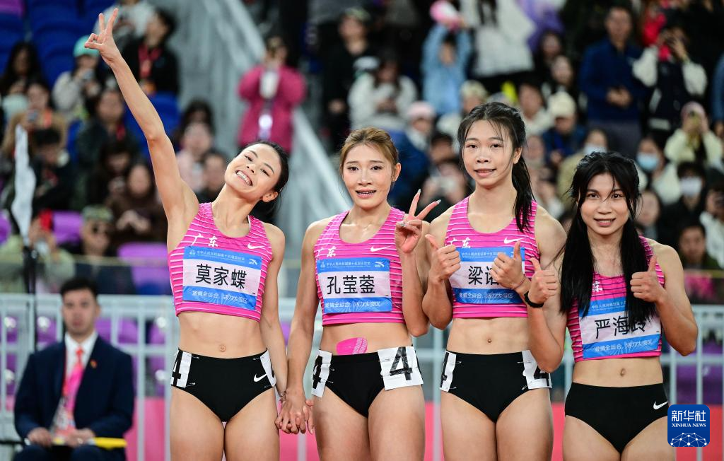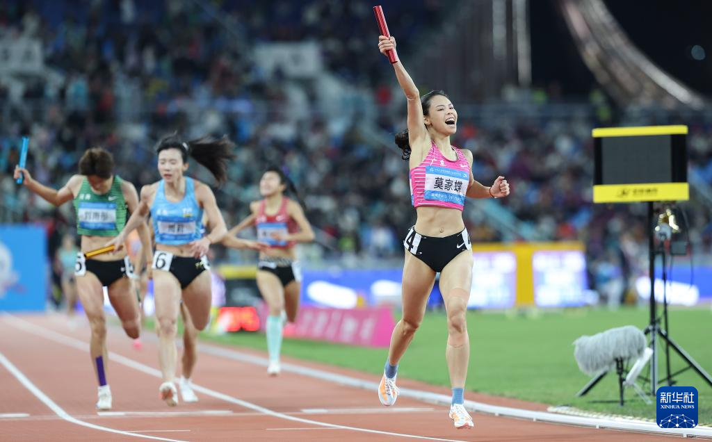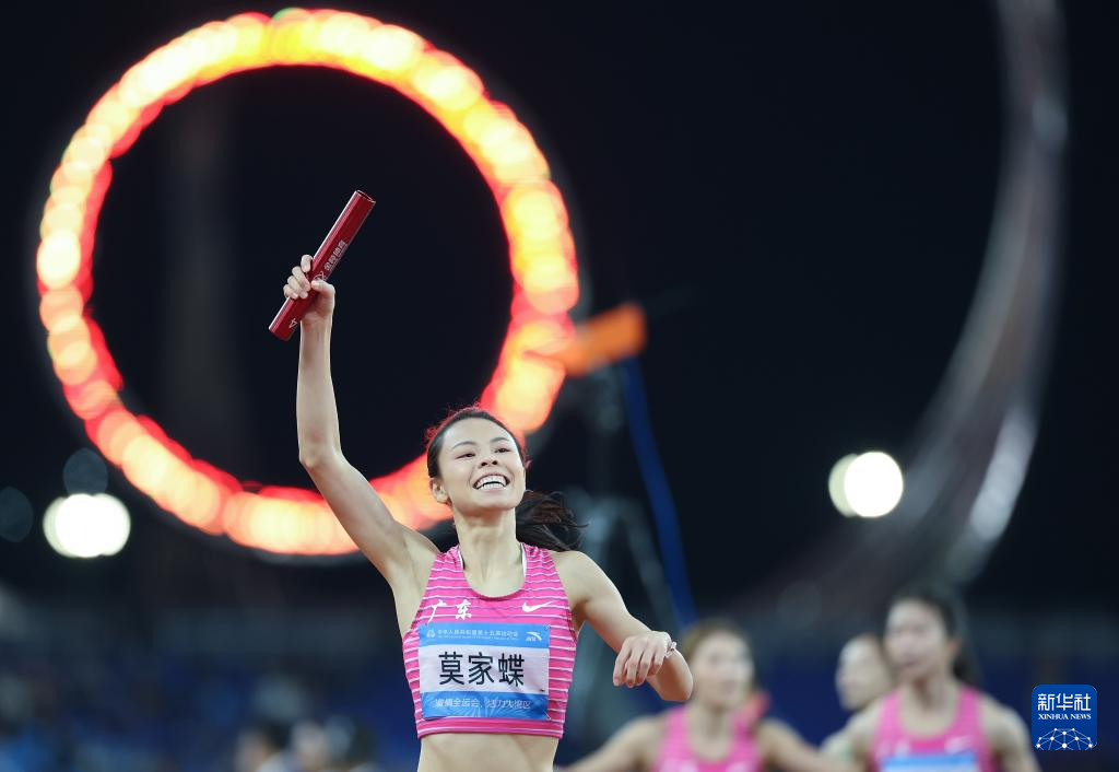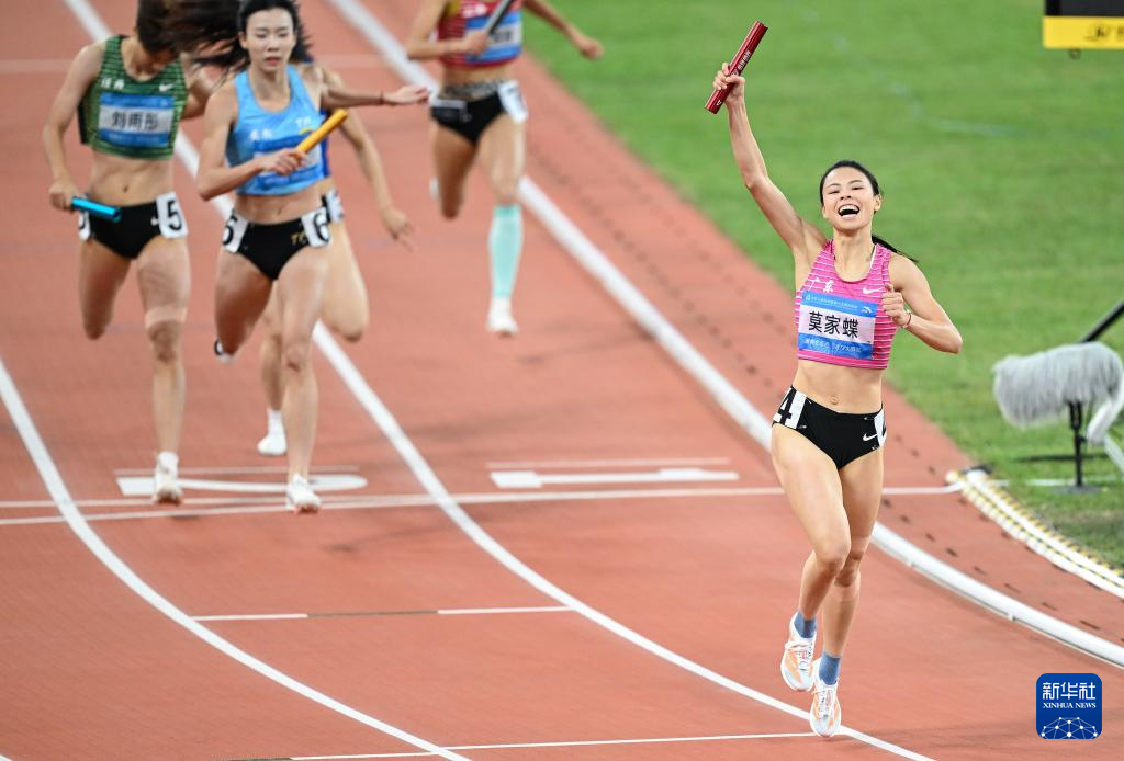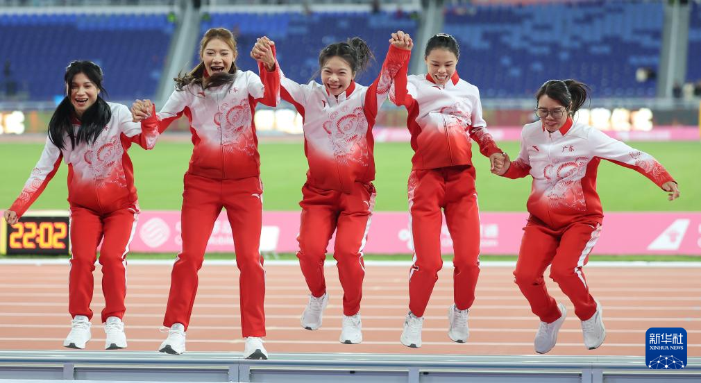 11月20日,广东队第四棒选手莫家蝶(前)在冲线后庆祝。广东队获得冠军。