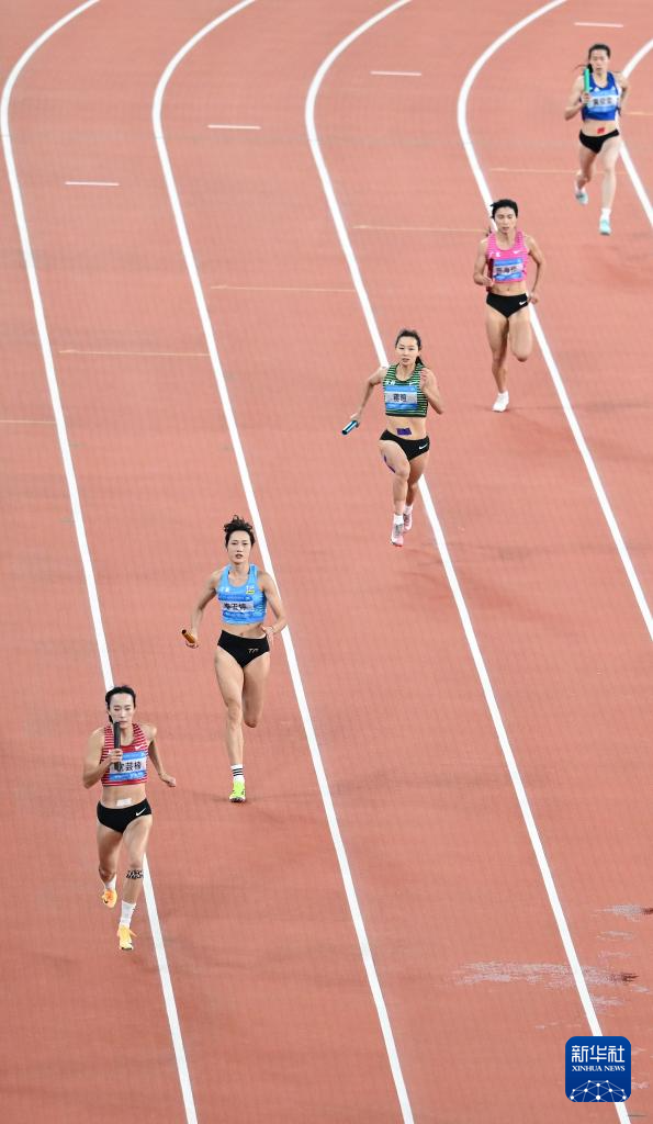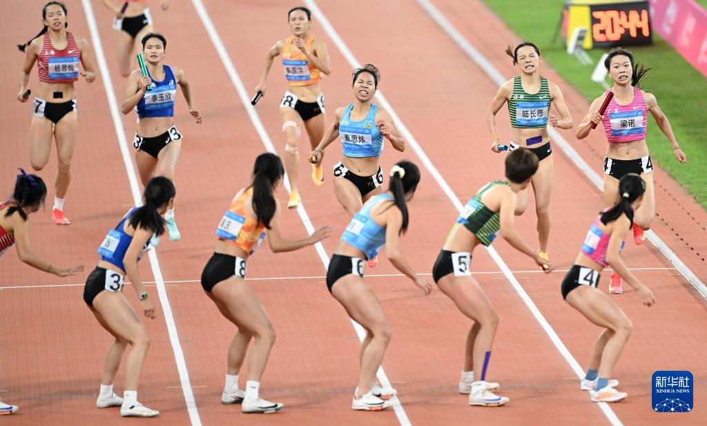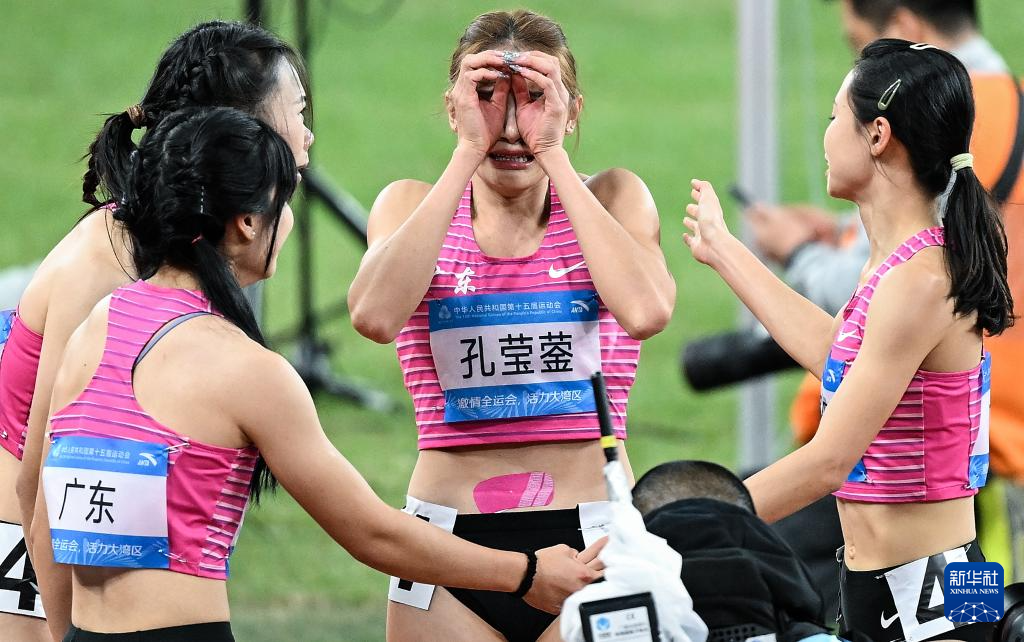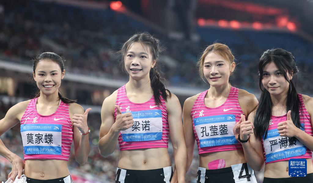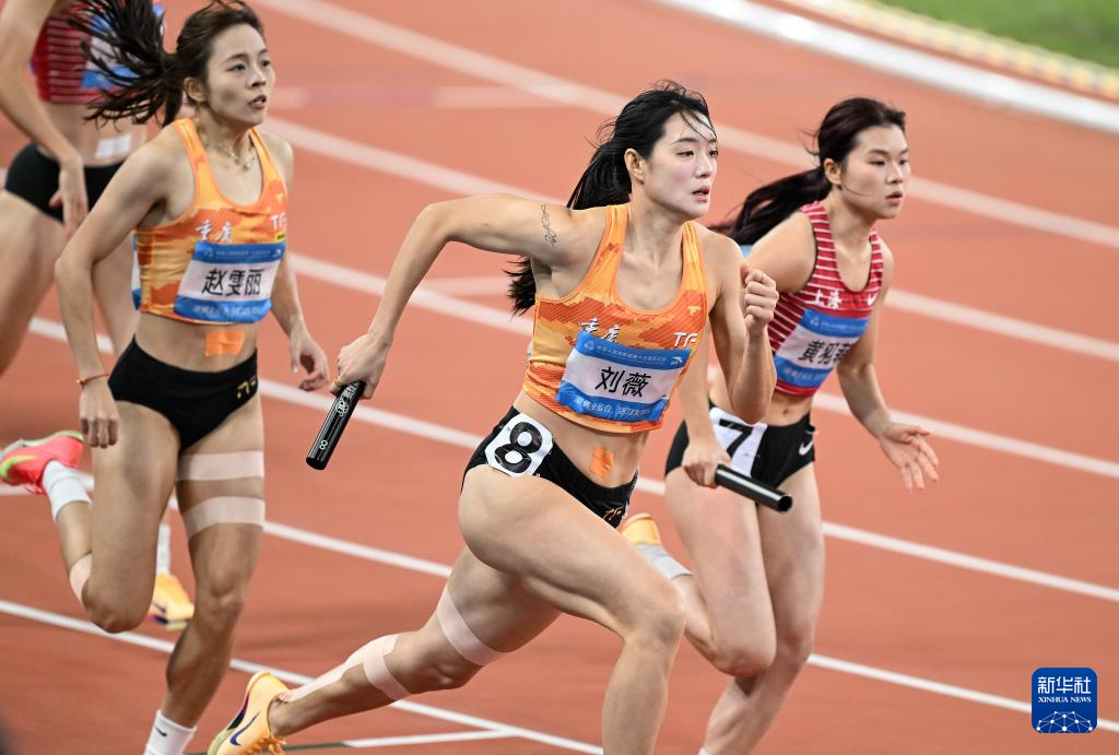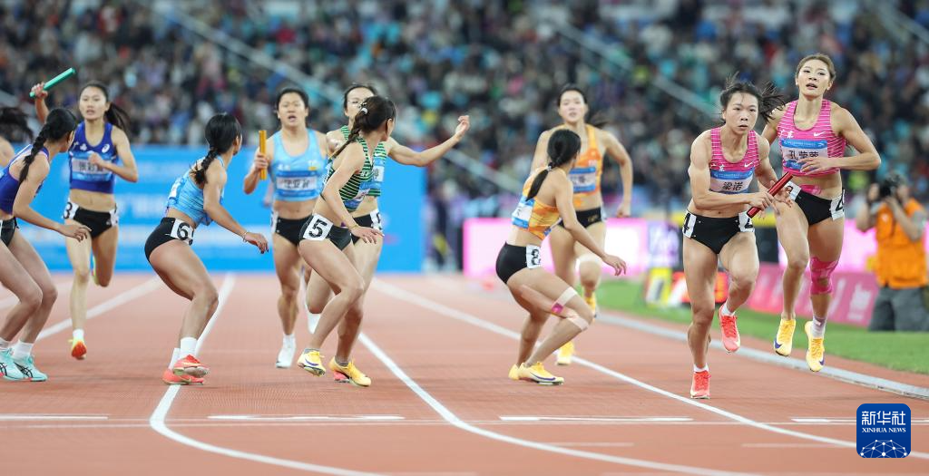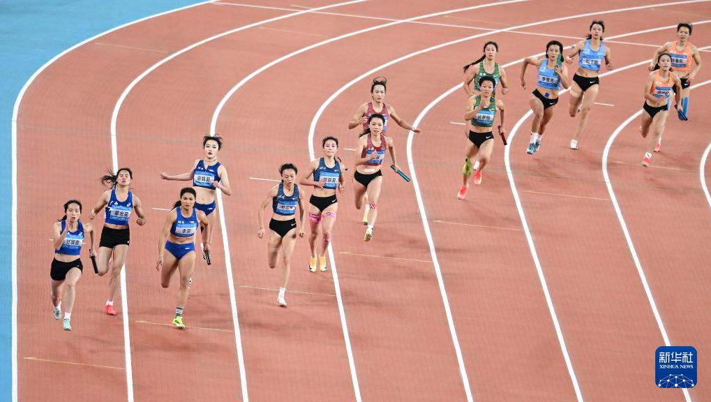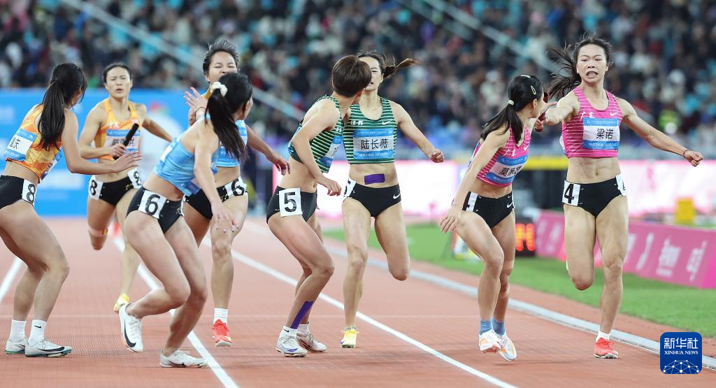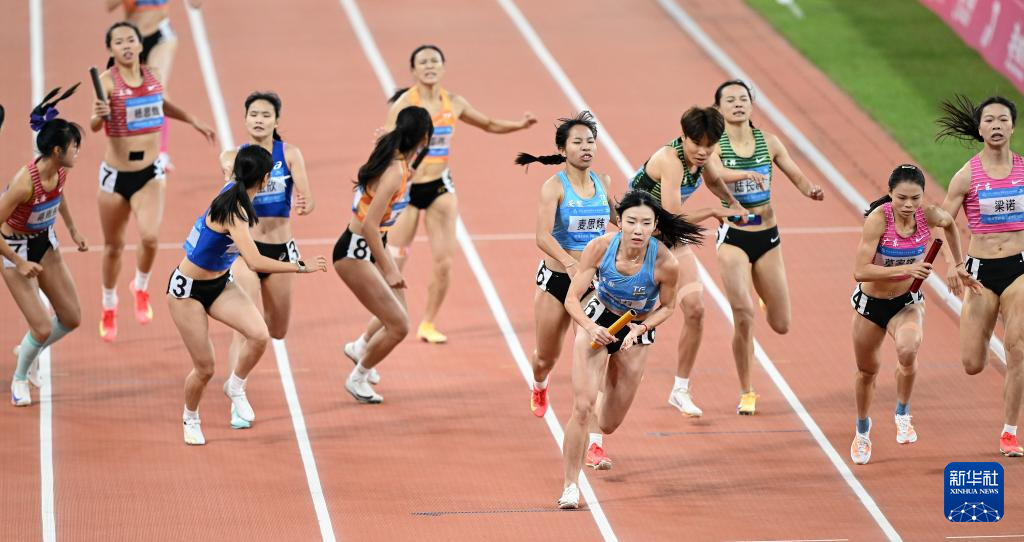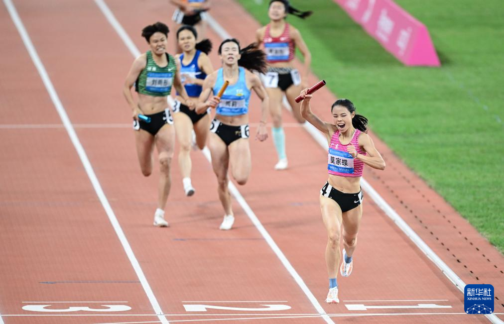 当日,第十五届全国运动会田径项目女子4X400米接力决赛在广州举行。