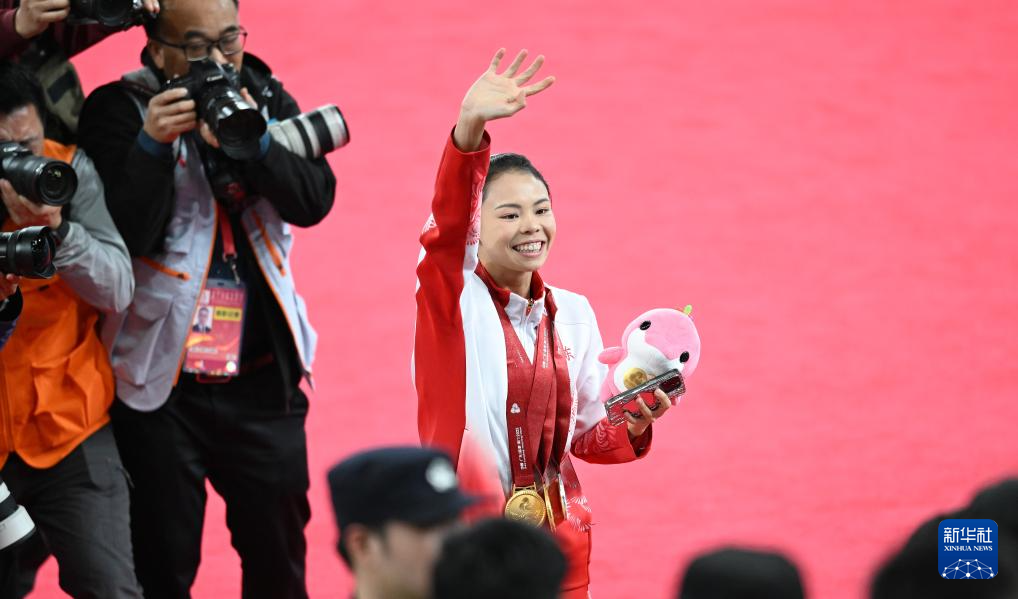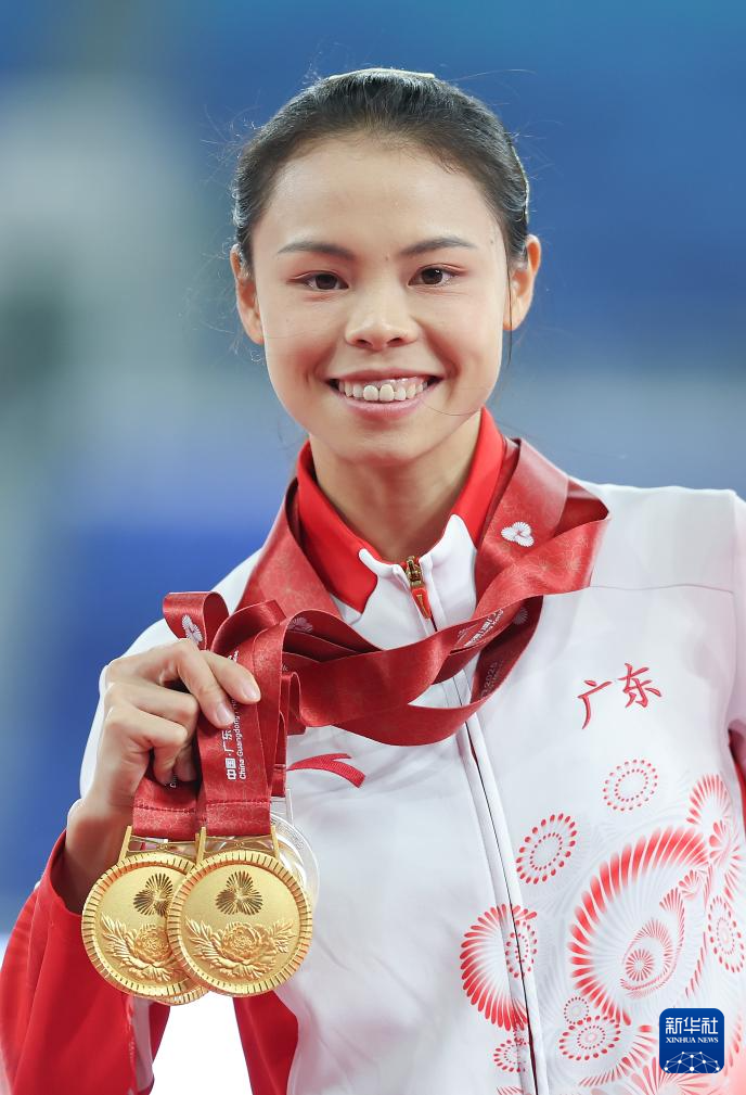 11月20日,广东队选手莫家蝶在颁奖仪式上展示她在本届全国运动会上获得的奖牌。