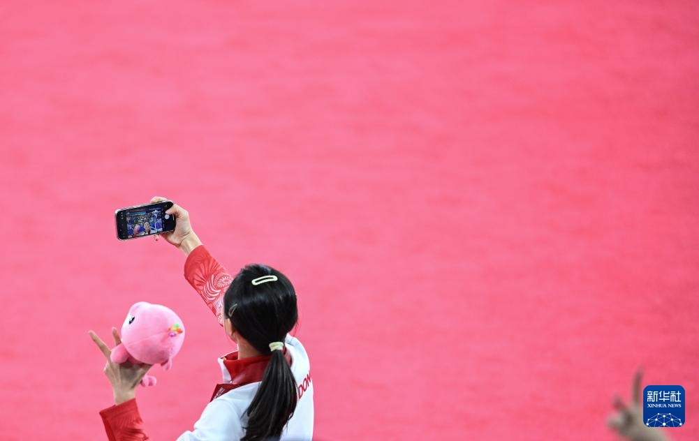 11月20日,广东队选手莫家蝶在颁奖仪式后与观众自拍合影。