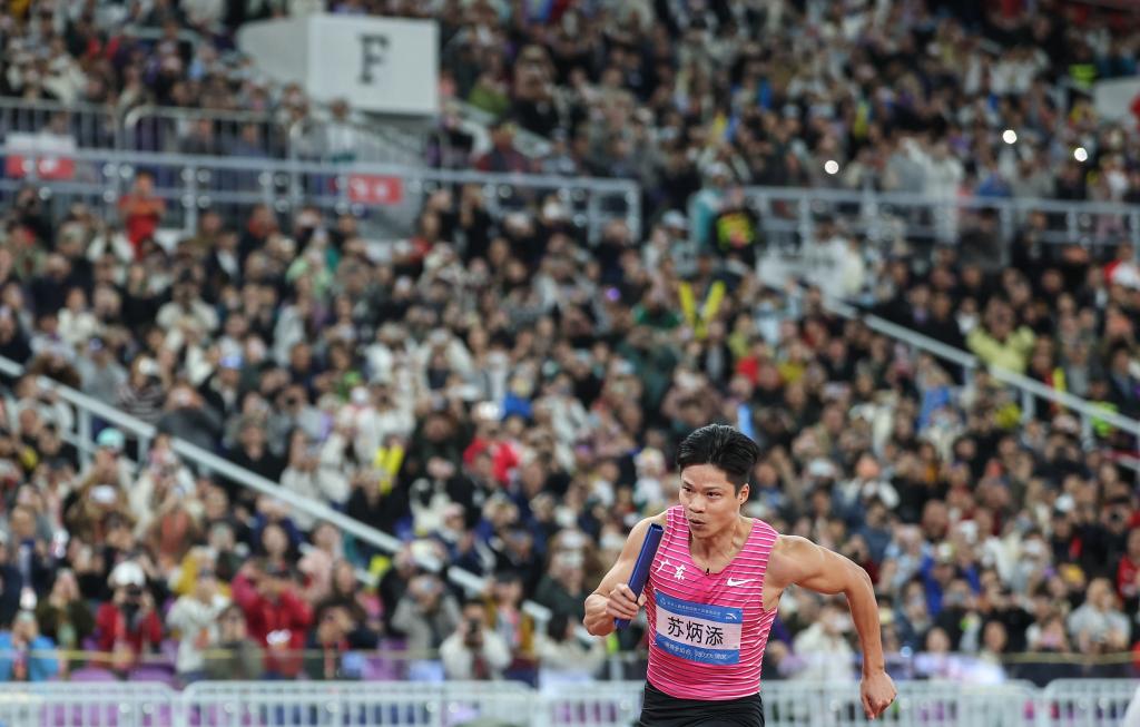 新华社广州11月20日电(记者周畅、刘旸、张武岳)苏炳添高举右手,向几近满员的观众席致意,随后和队友一起,双手从右下方合拢后往前发出“冲击”。