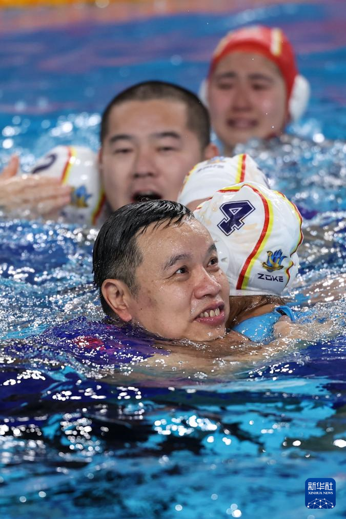 11月21日,上海队主教练李文华(前)在泳池中庆祝。