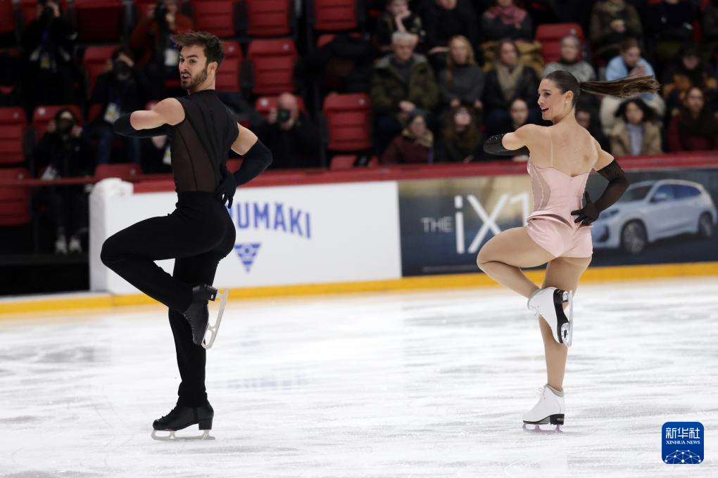 11月21日,法国组合劳伦斯·富尼耶·博德里(右)/纪尧姆·西泽龙在冰舞韵律舞比赛中。最终,他们暂列第一名。