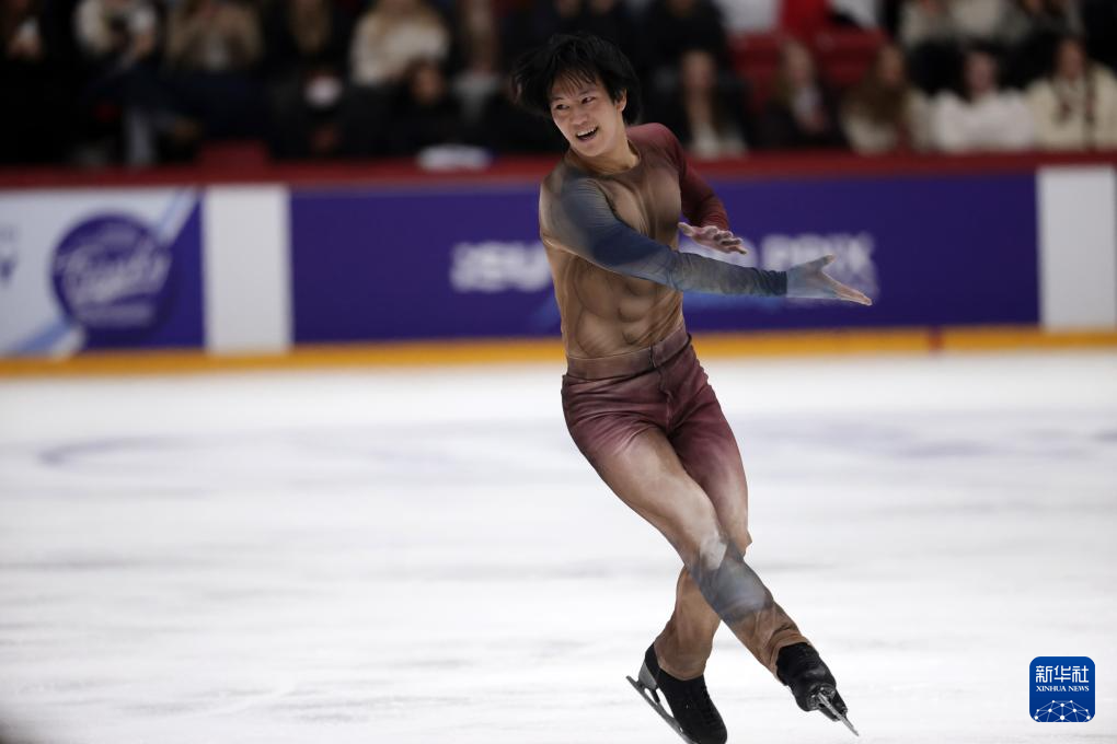 11月21日,法国选手萧传文在男单短节目比赛中。最终,他暂列第一名。